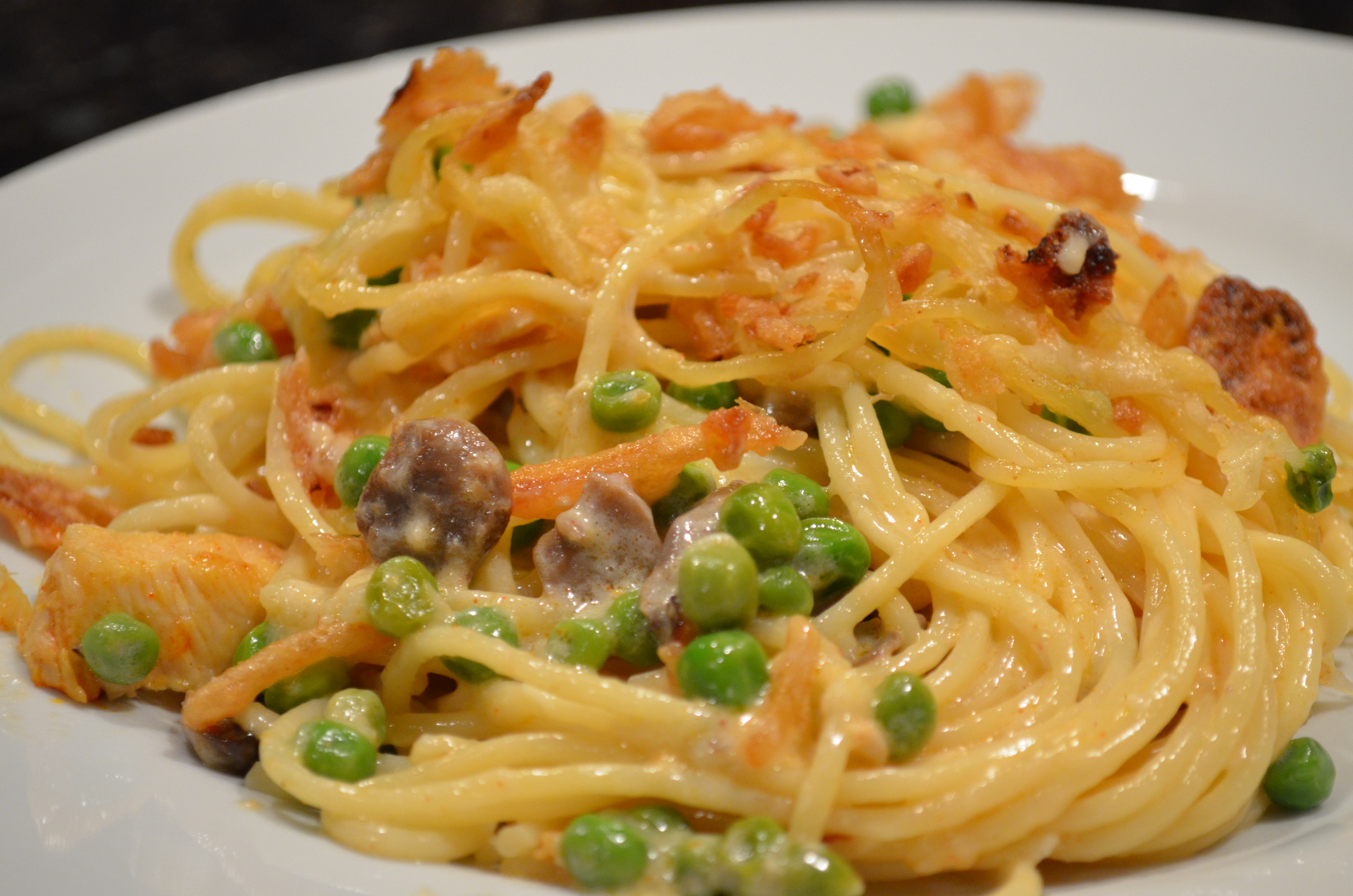Here is an idea for an over the top, cheesy, creamy main dish pasta casserole. I love the hint of white wine flavor in the sauce and the crunch from the fried onions.