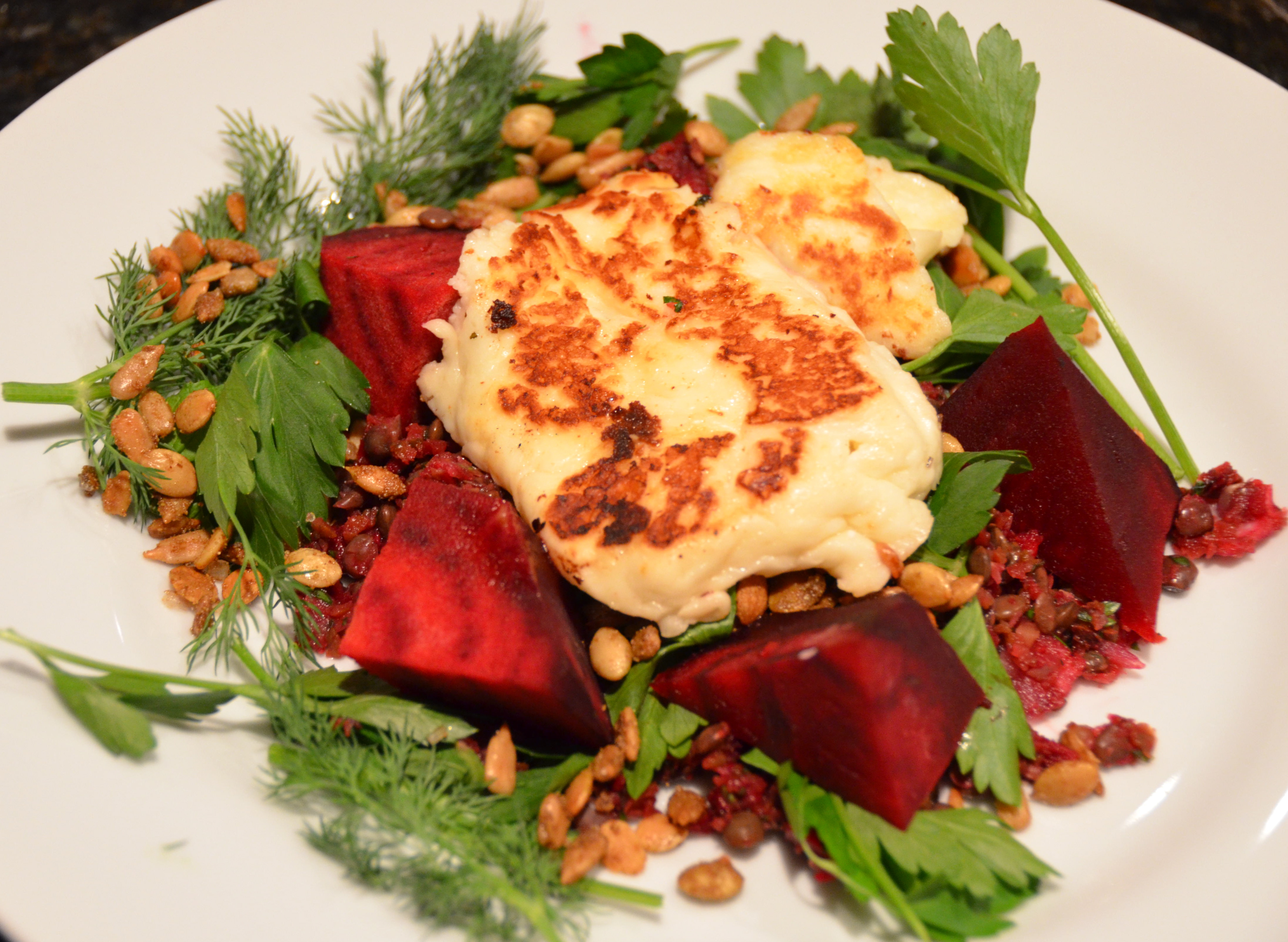 What you get is a plethora (sorry, but I need to expand my description vocabulary) of flavors and textures. Cold beets against hot halloumi. Crunchy seeds and soft lentils. Tart gherkins and the crisp contrast of mixed herbs.