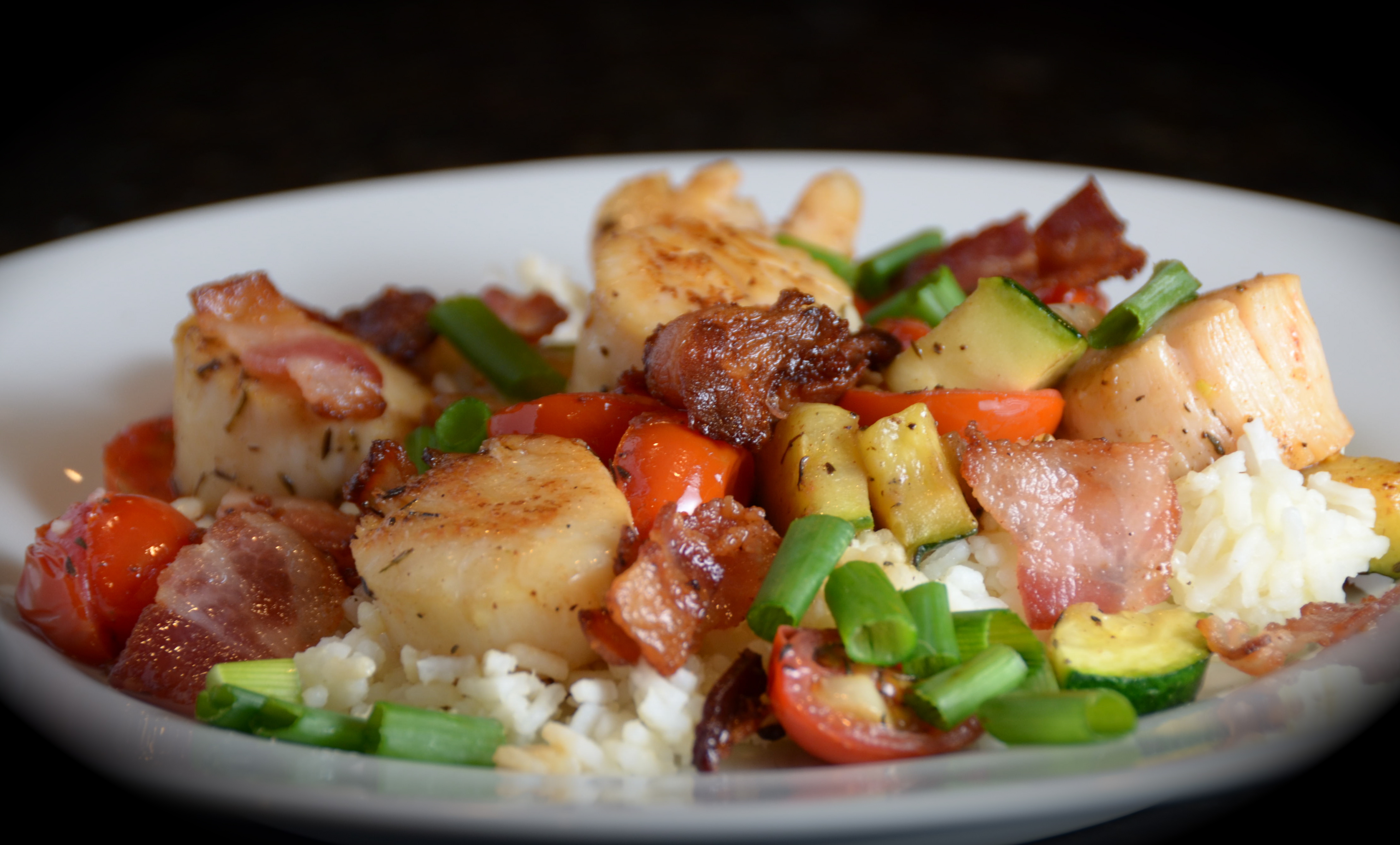 4. Fluff rice with a fork and spoon the scallop mixture over the rice. Sprinkle with green onions and bacon.