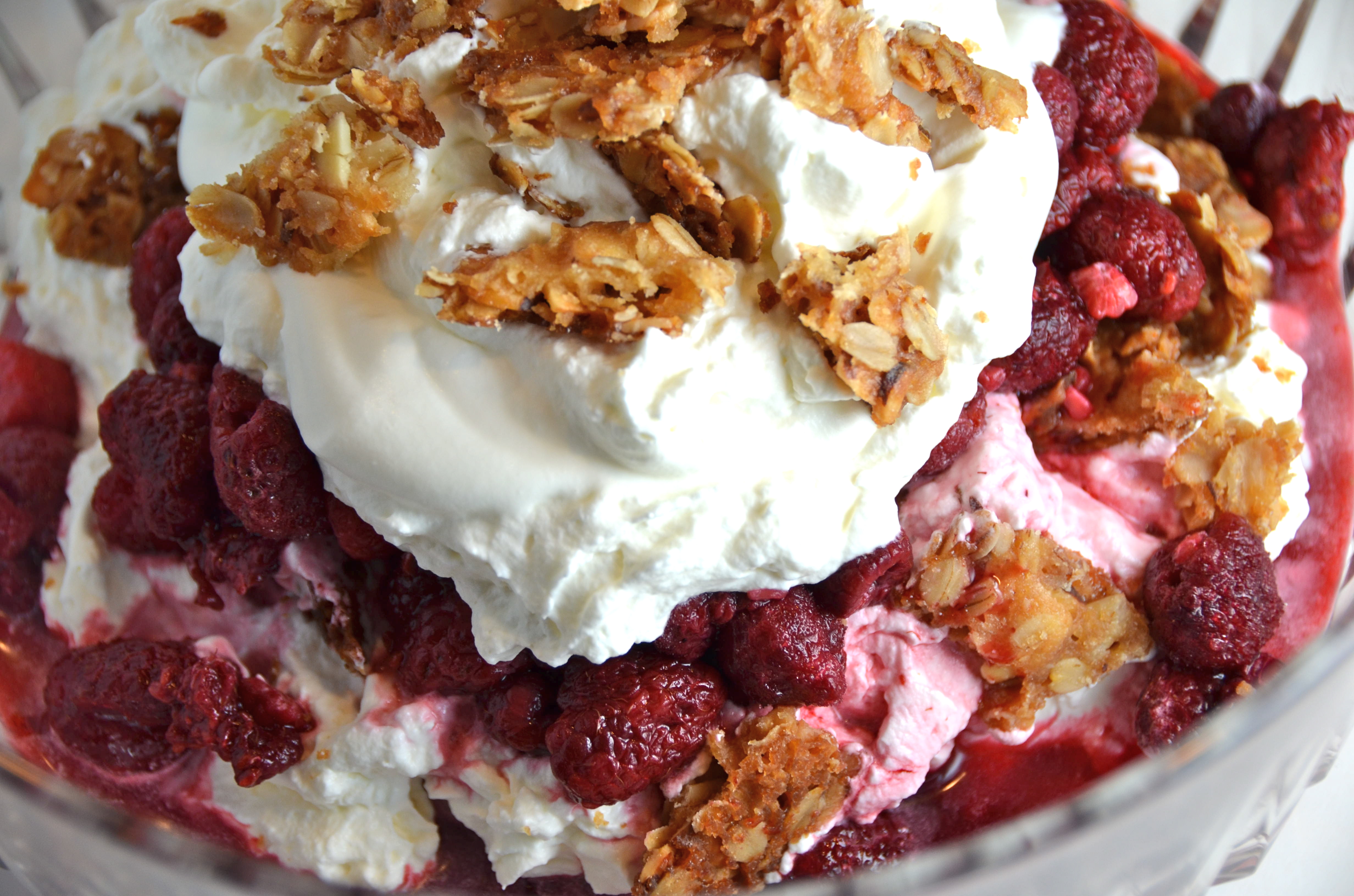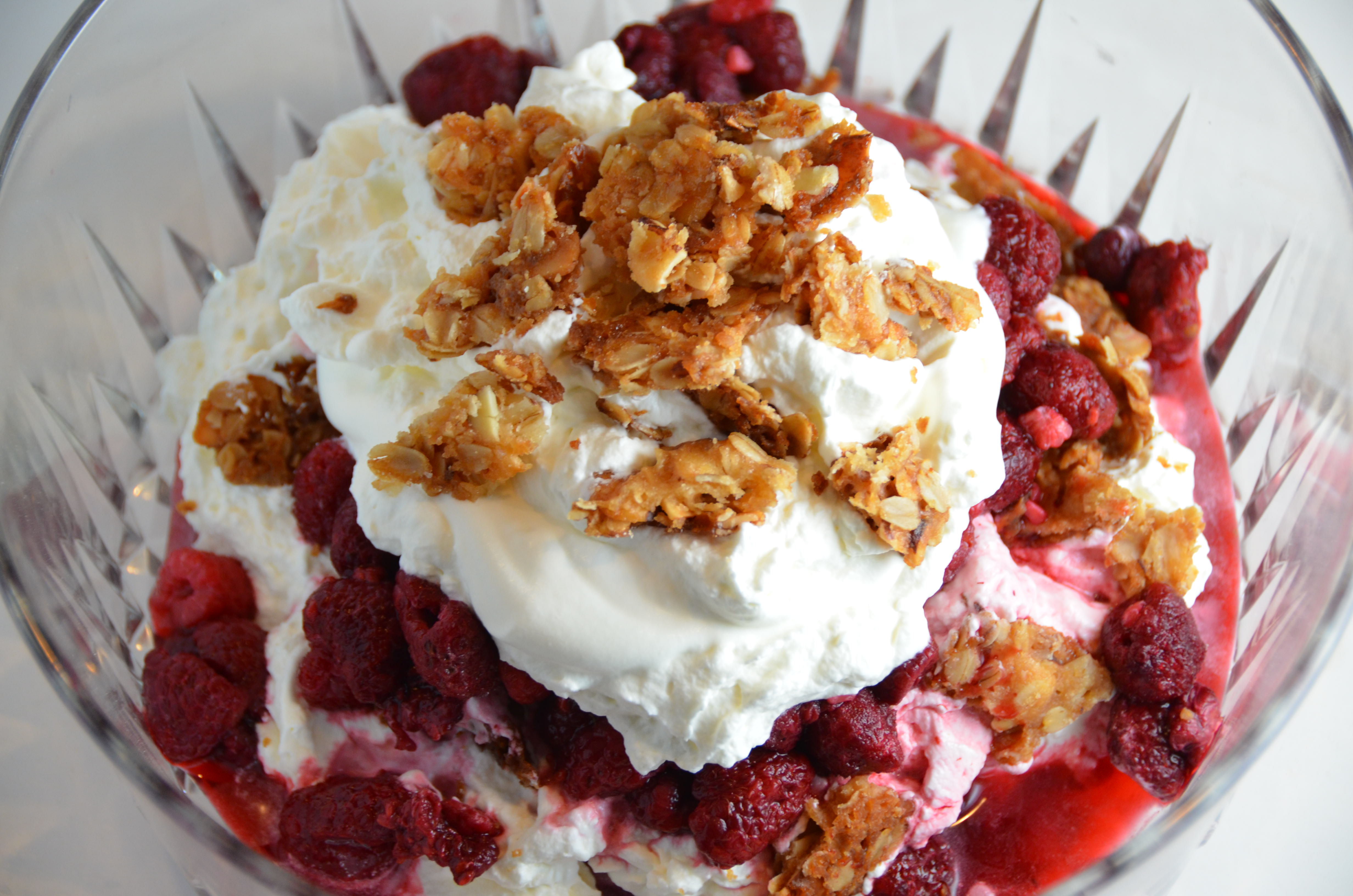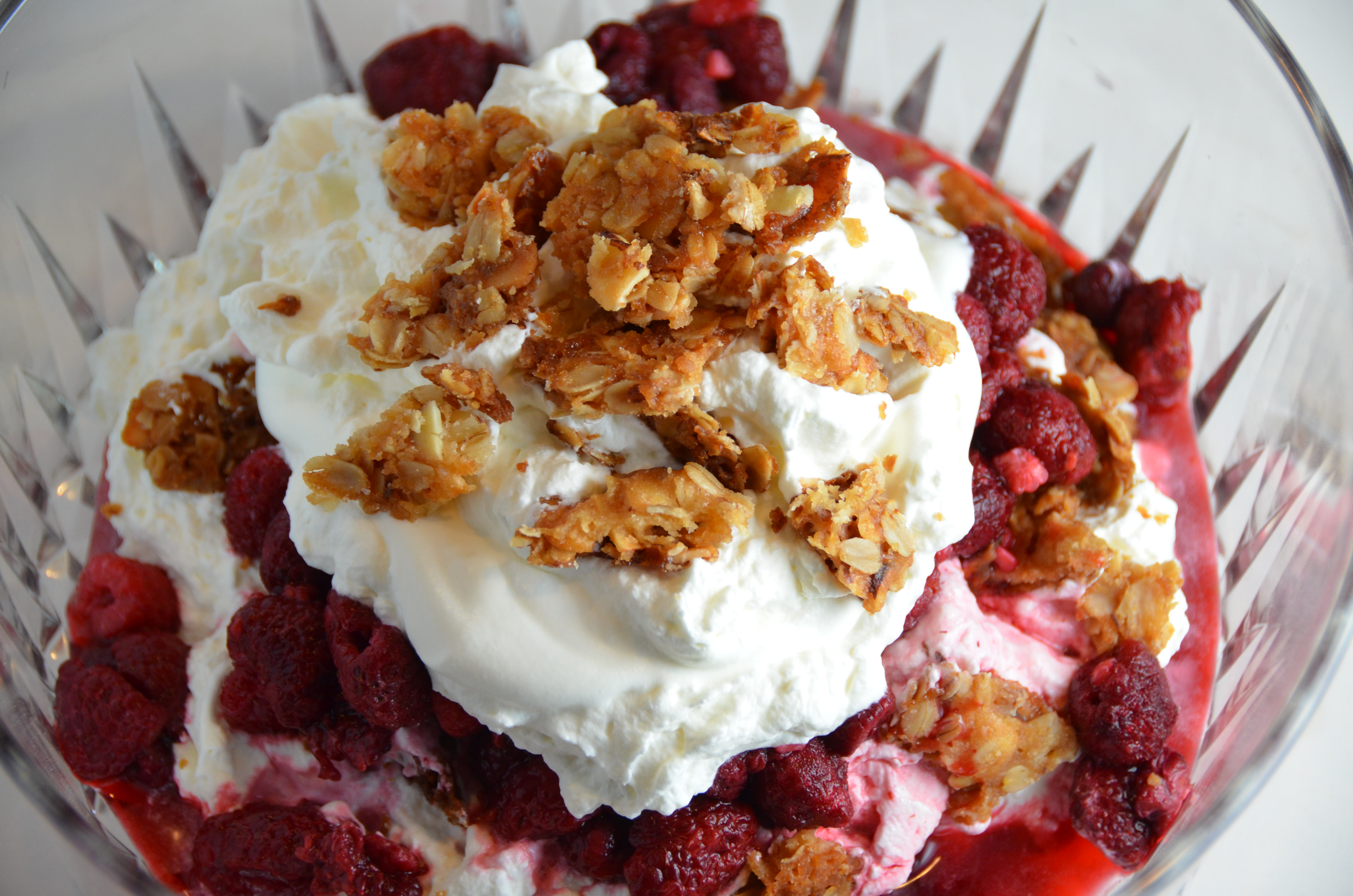 Frozen raspberries means you can have a hint of summer on your table in January. Layer the raspberries with whisky scented whipped cream and a completely addictive nutty oatmeal crunch.