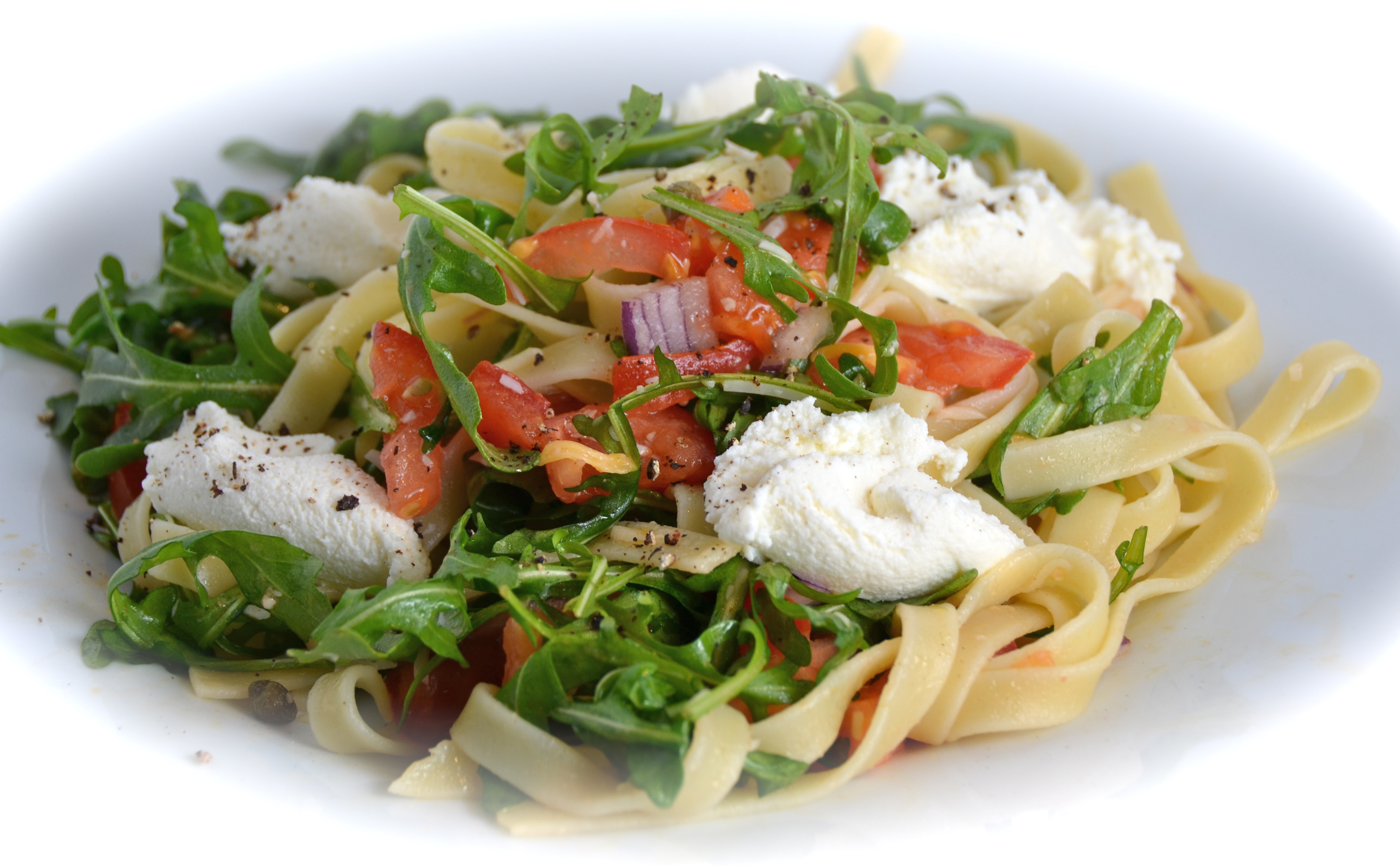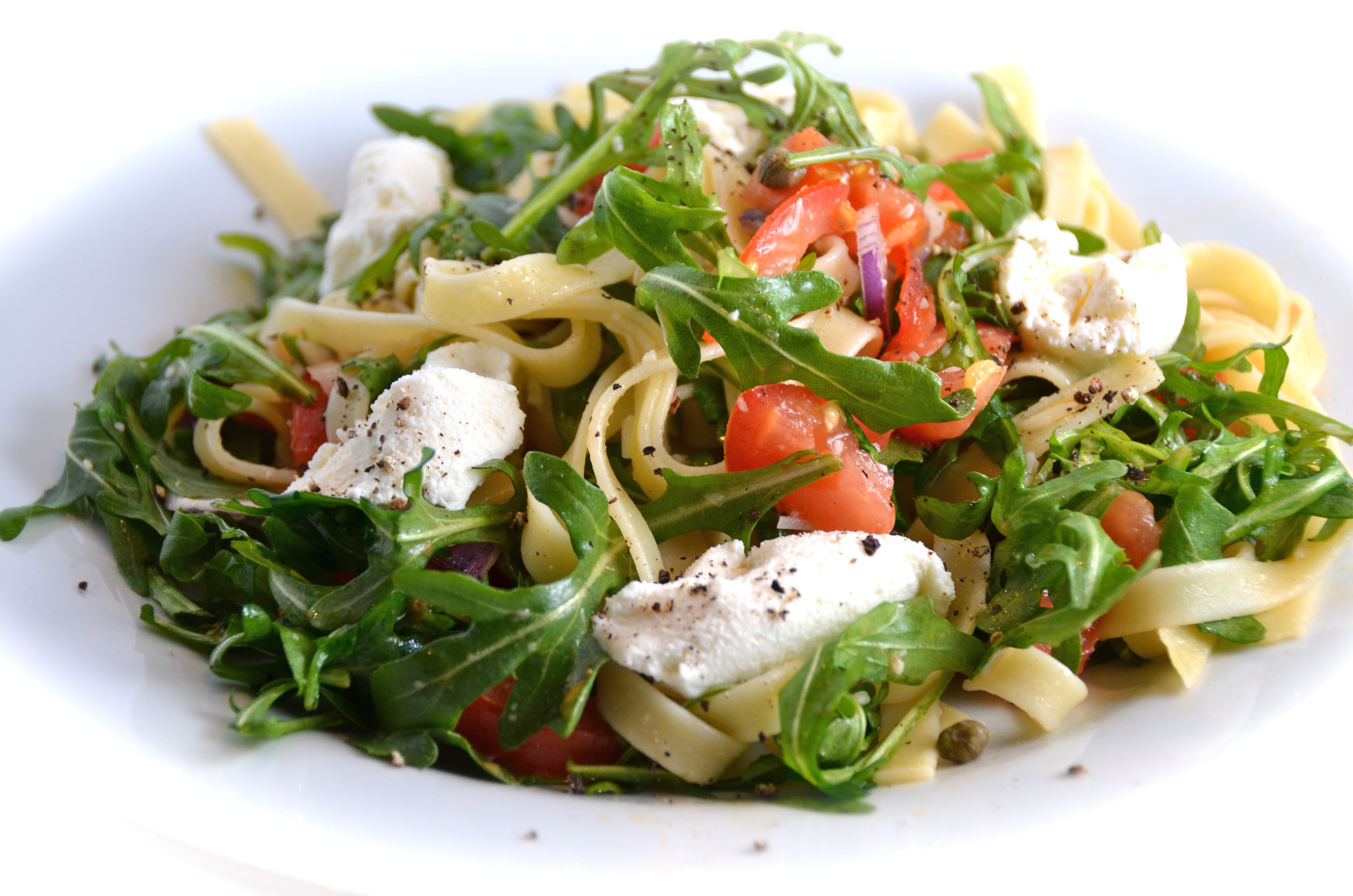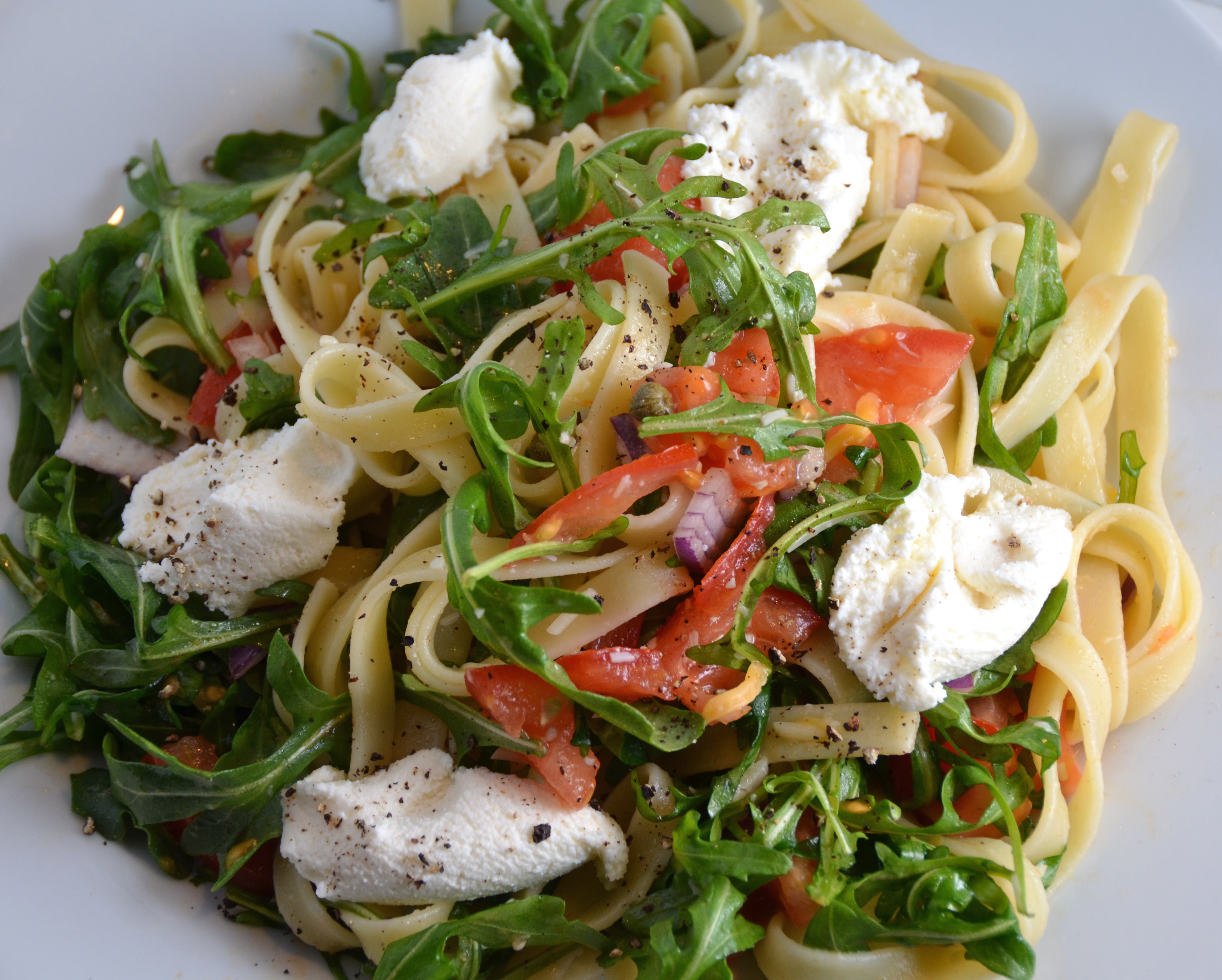 If you are impatient for spring to finally get on with it, make this light, fresh tasting and simple pasta dish. It looks cheerful with its bright colors and the caper, ricotta, arugula combination is so unexpectedly delicious.