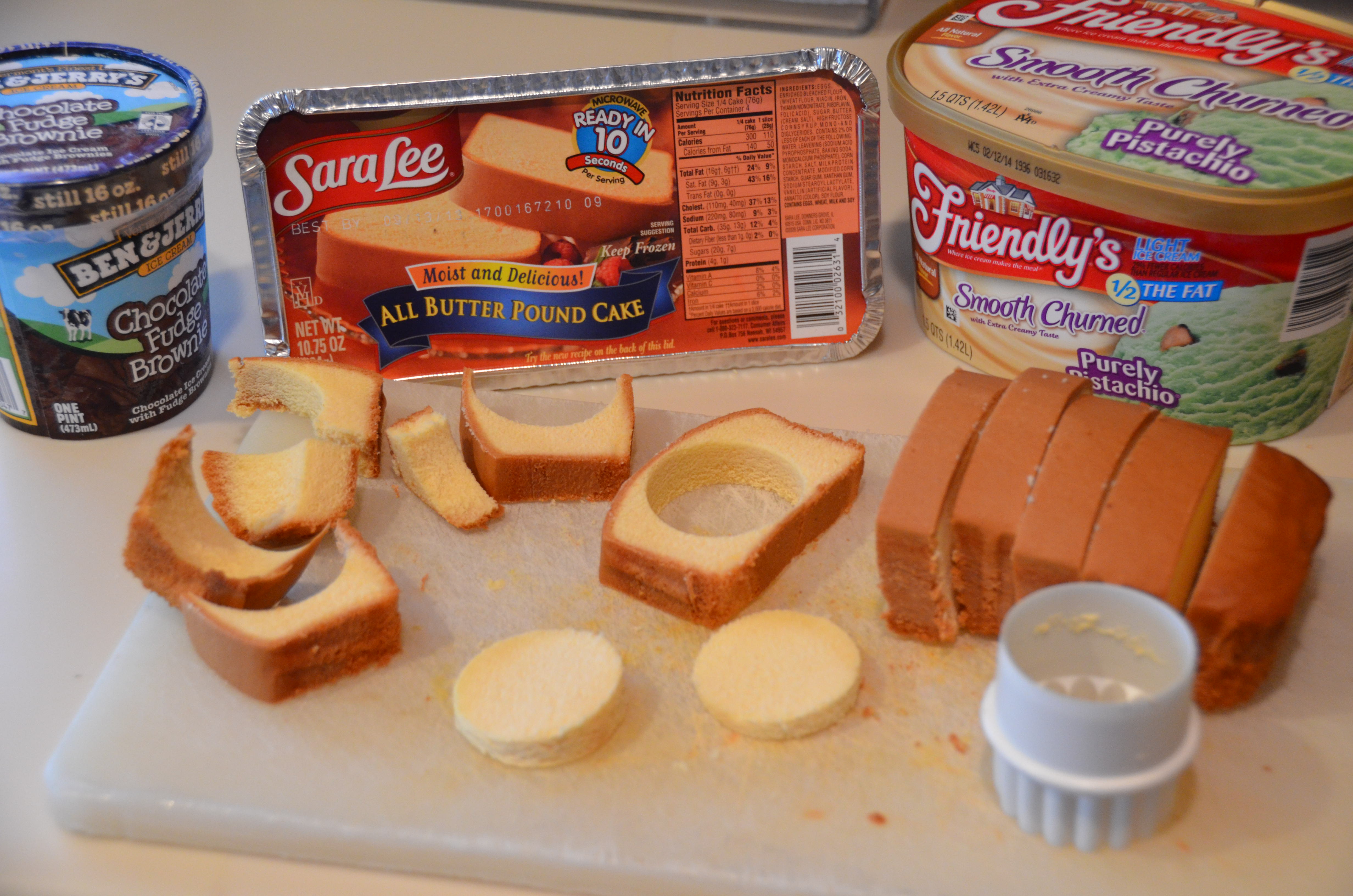 4. Place pint of chocolate ice cream on its side and, using a serrated knife, slice through the ice cream carton to make six i/2 inch slices. Peel away the carton from one slice and use the biscuit cutter to cut out a round of ice cream. Place the ice cream round on top of the pound cake. Use your fingers to reshape the remainder of the ice cream so that you can cut another round from it. Repeat with the remaining ice cream slices for a total of 12 ice cream rounds on top of the 12 pound cake slices.
