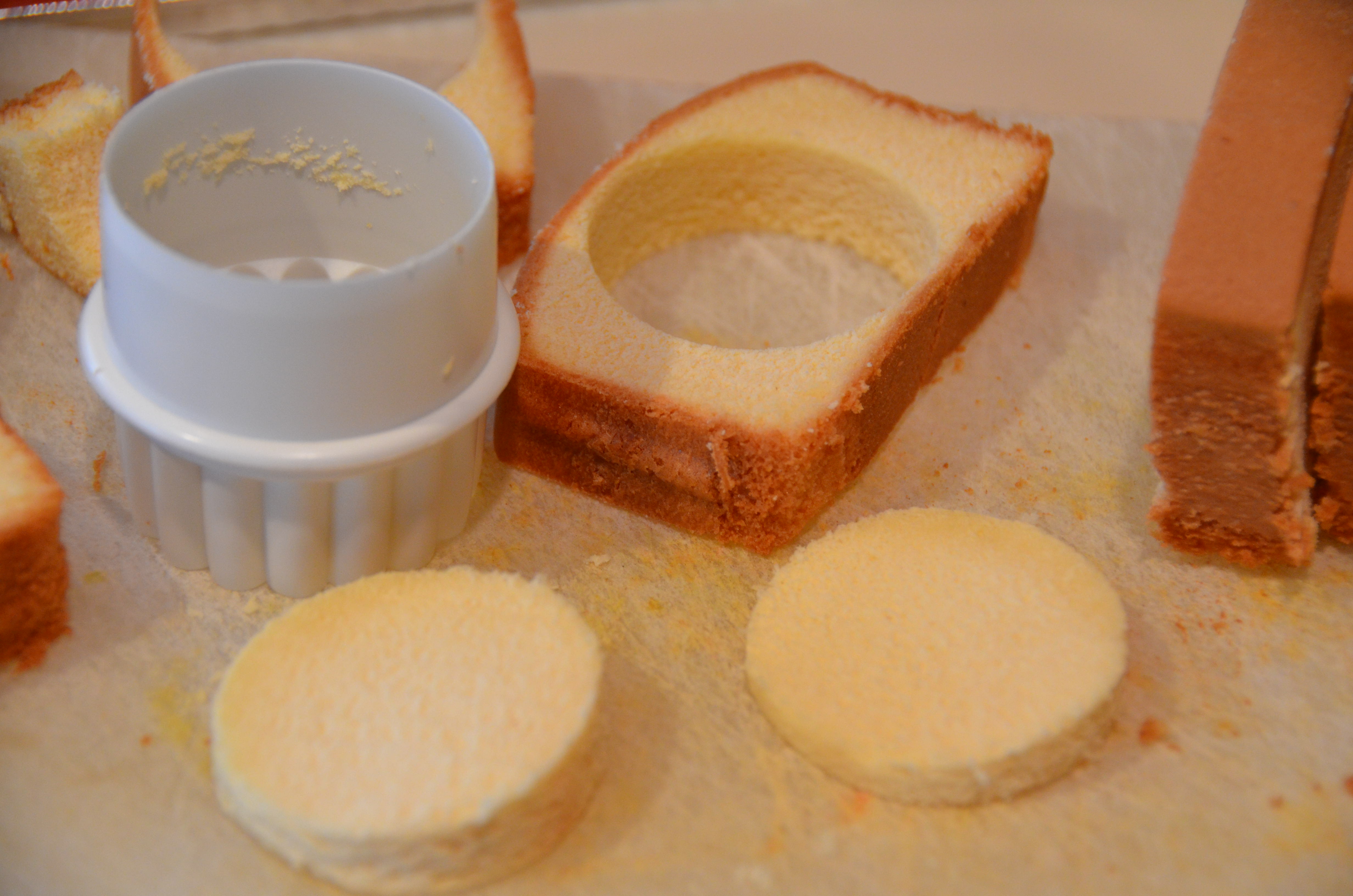 2. Slice the pound cake into 1/4 inch slices. Use a 1 3/4 inch biscuit cutter to cut rounds out of the pound cake. Cut a total of 24 rounds.