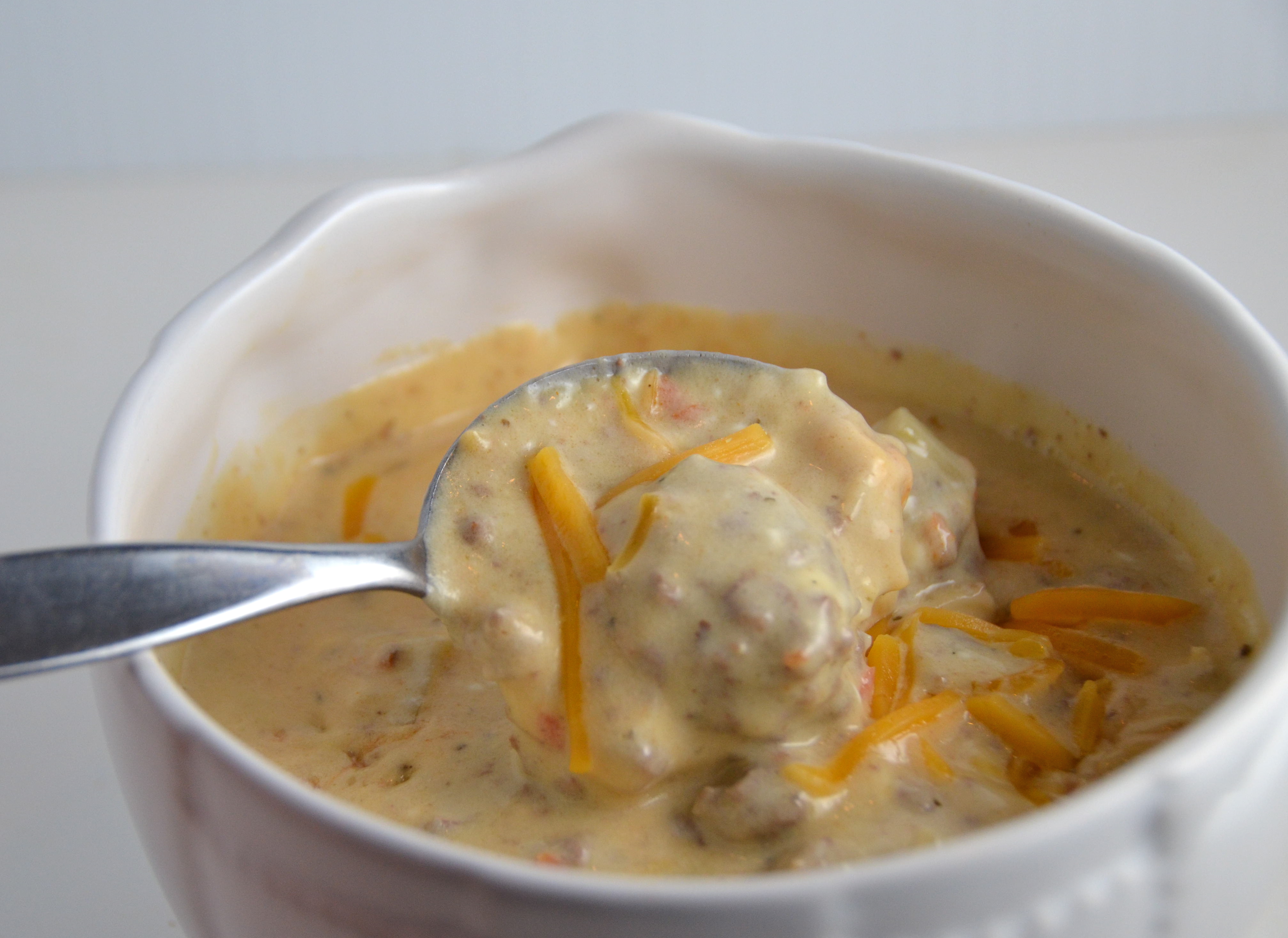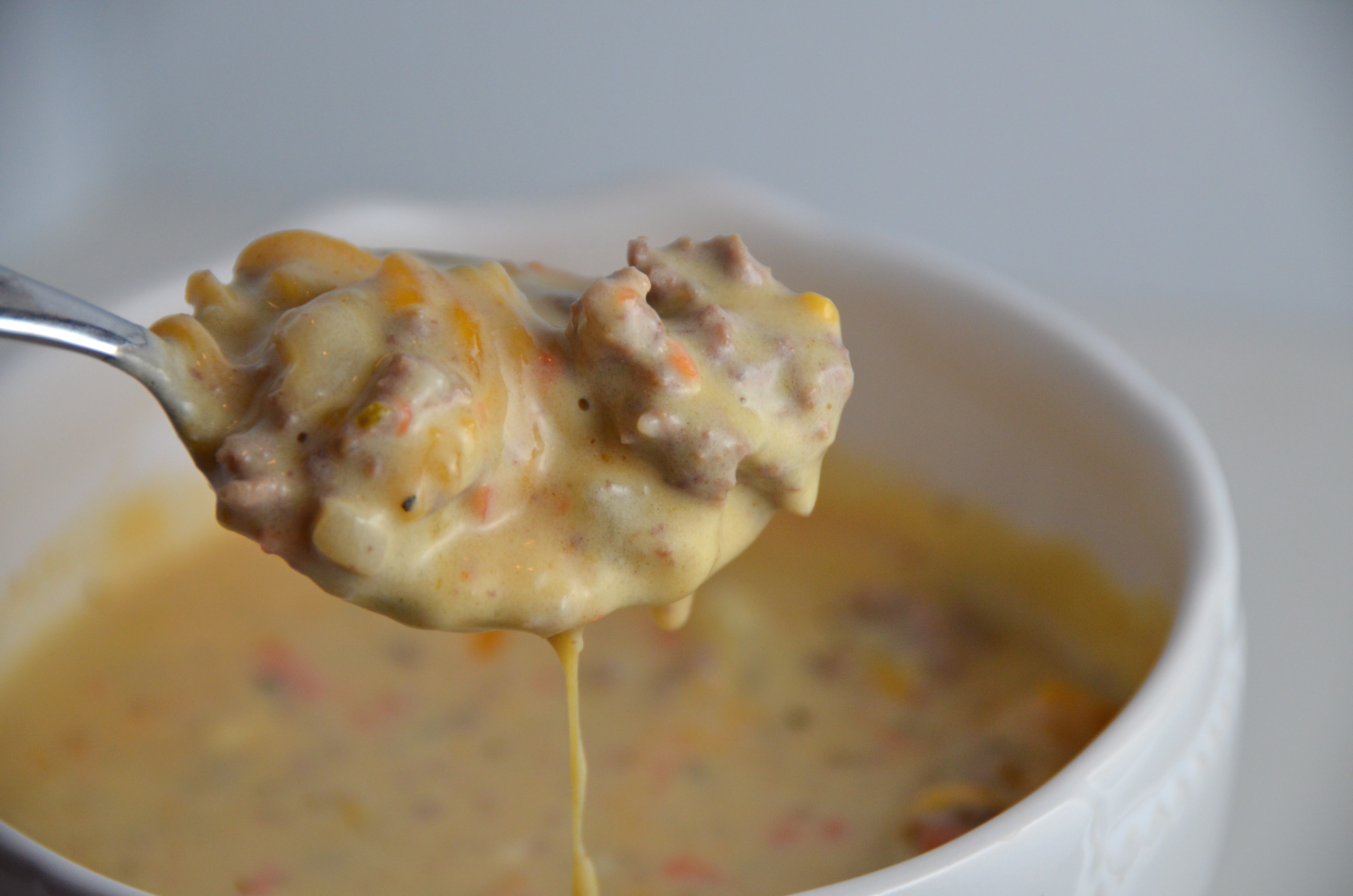 This is one of the best cheese based soups I have ever tried. I usually avoid Velveeta whenever possible, but it totally works in this recipe. Maybe because the soup is loaded with ground beef and vegetables. Maybe because the whole soup gets a royal smoothness from sour cream added at the finish.