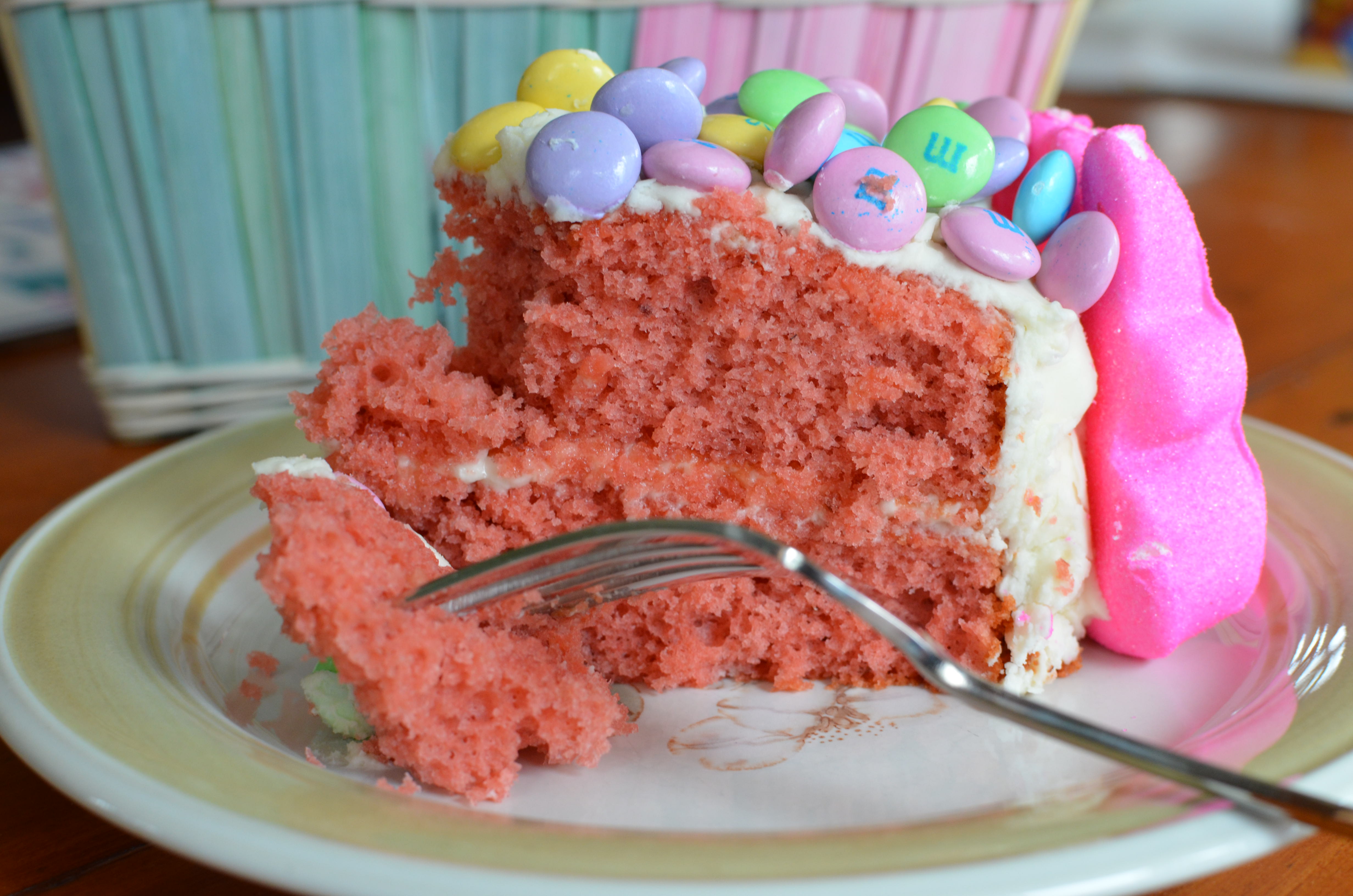 I used one of my favorite cakes, an unbelievably wonderful strawberry one. Very easy to make as it starts with a mix. It is heavenly with cream cheese icing. I’d definitely urge you to give it a try, but your favorite cake would stand in just fine.
