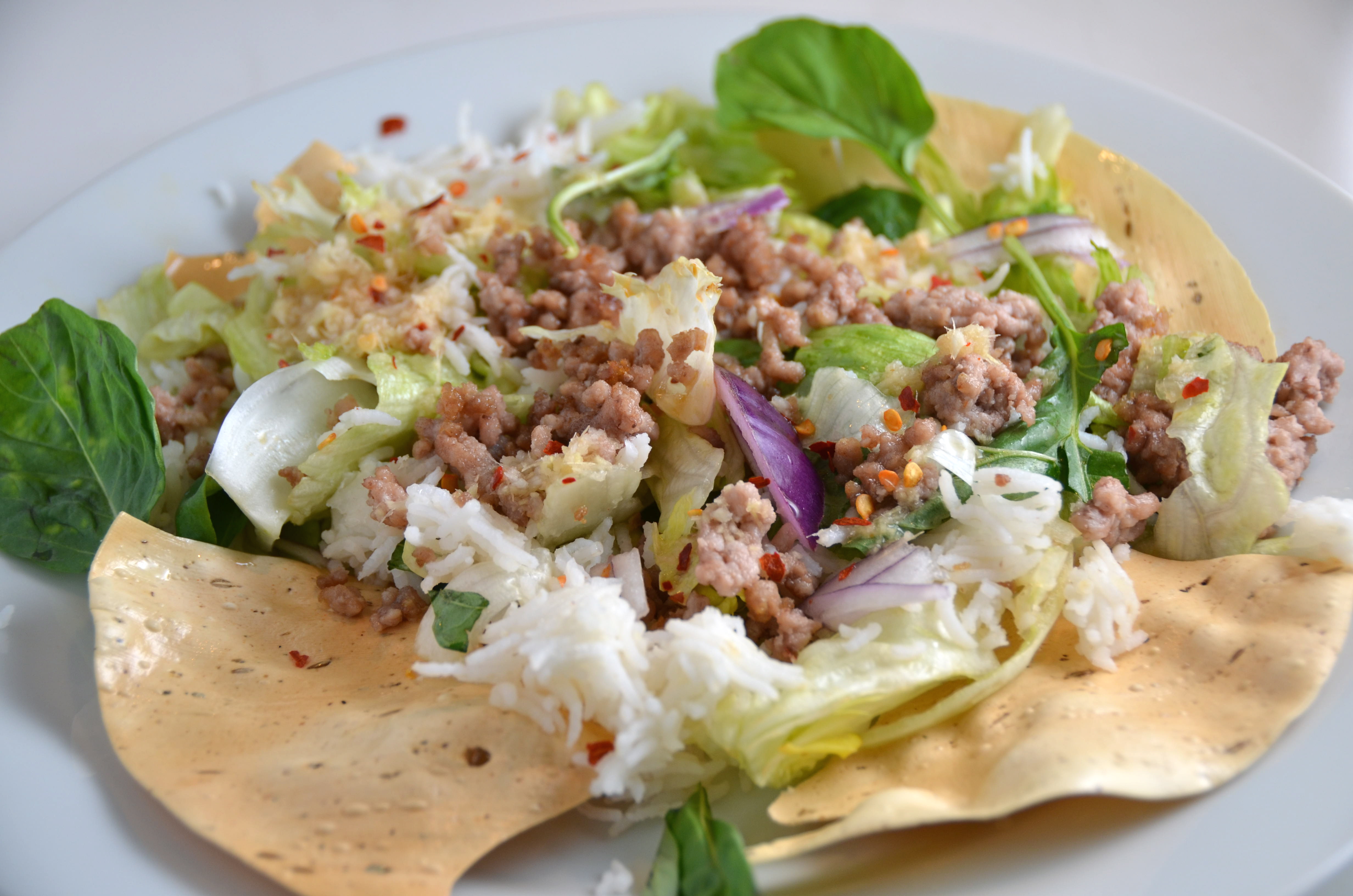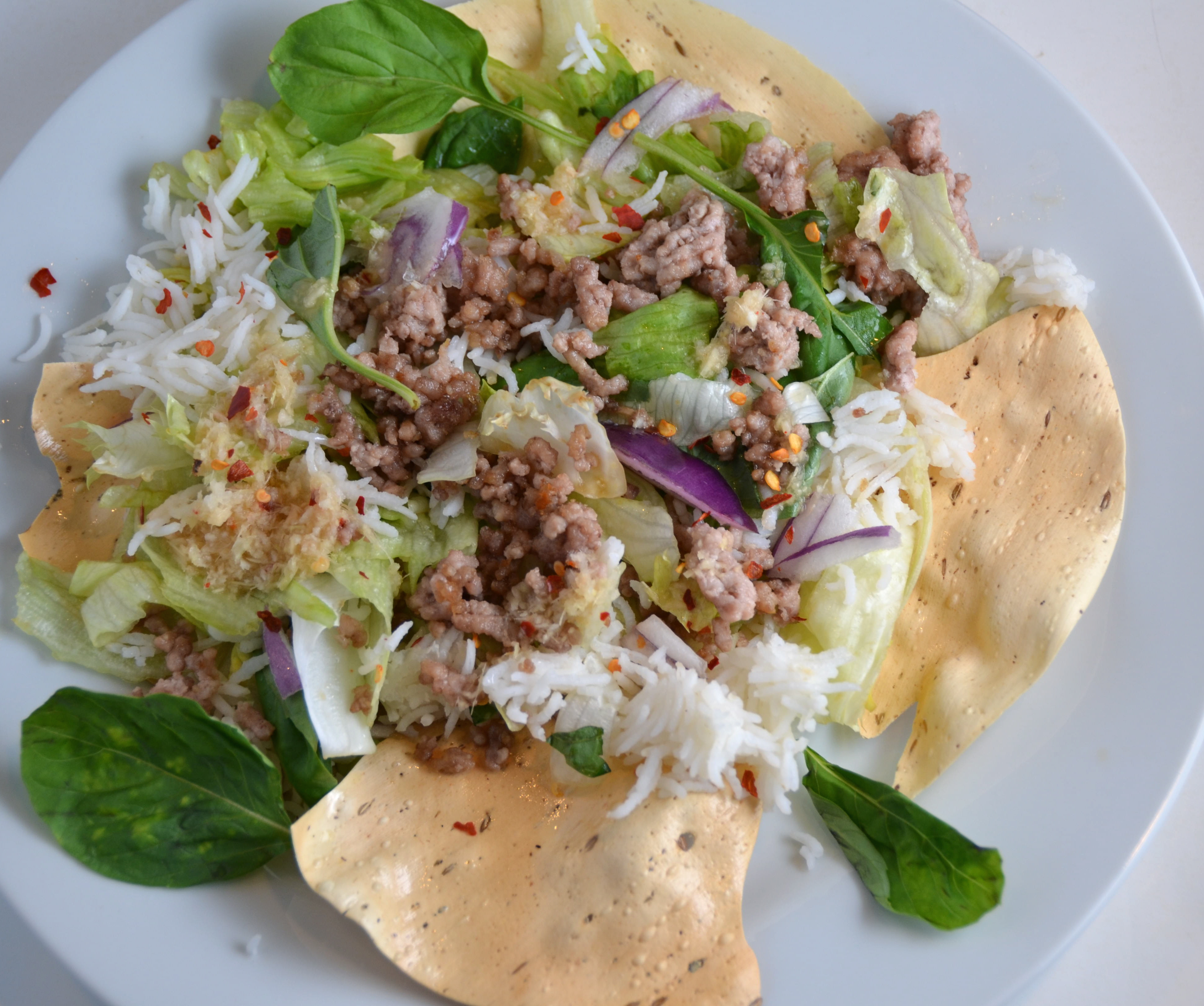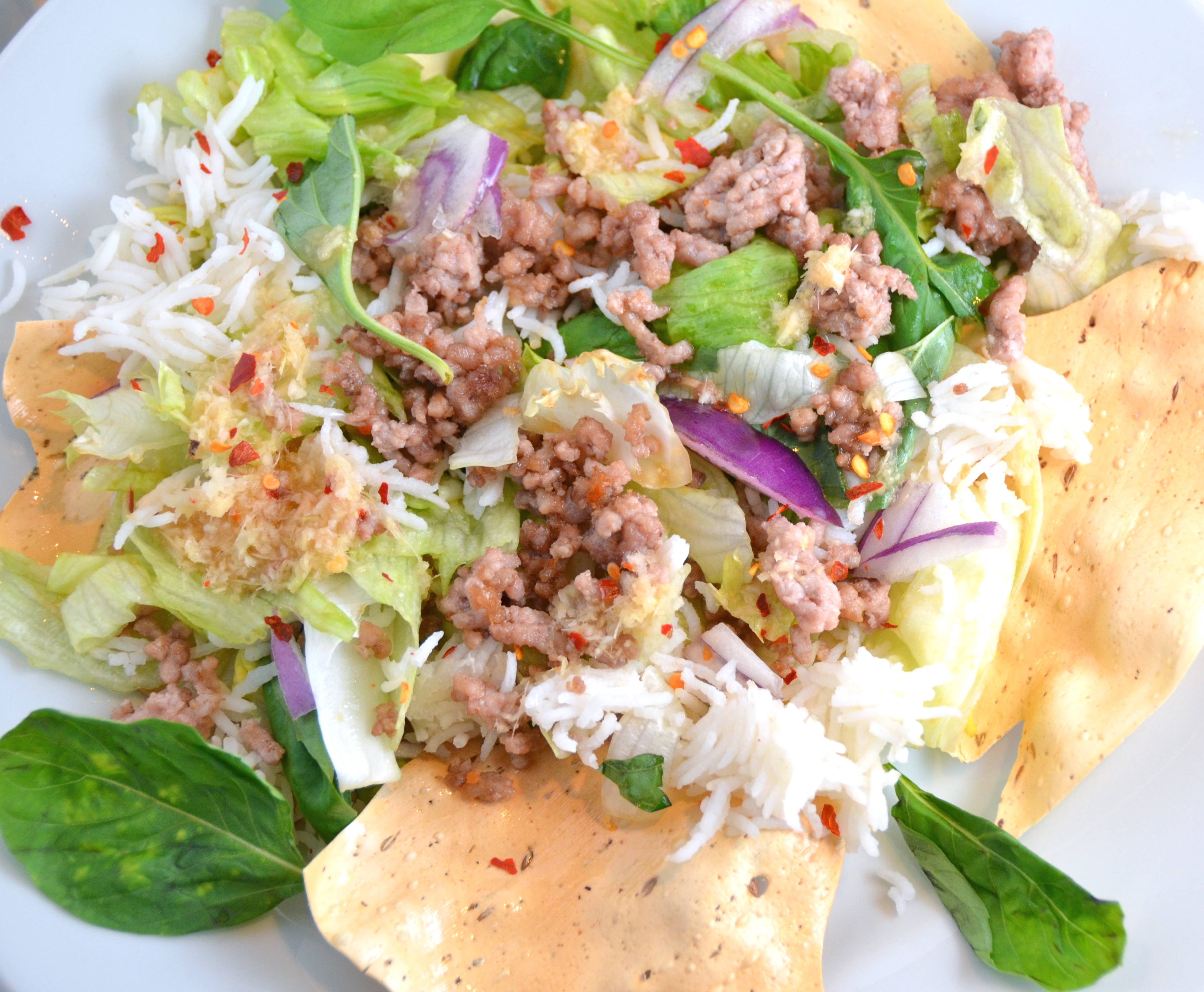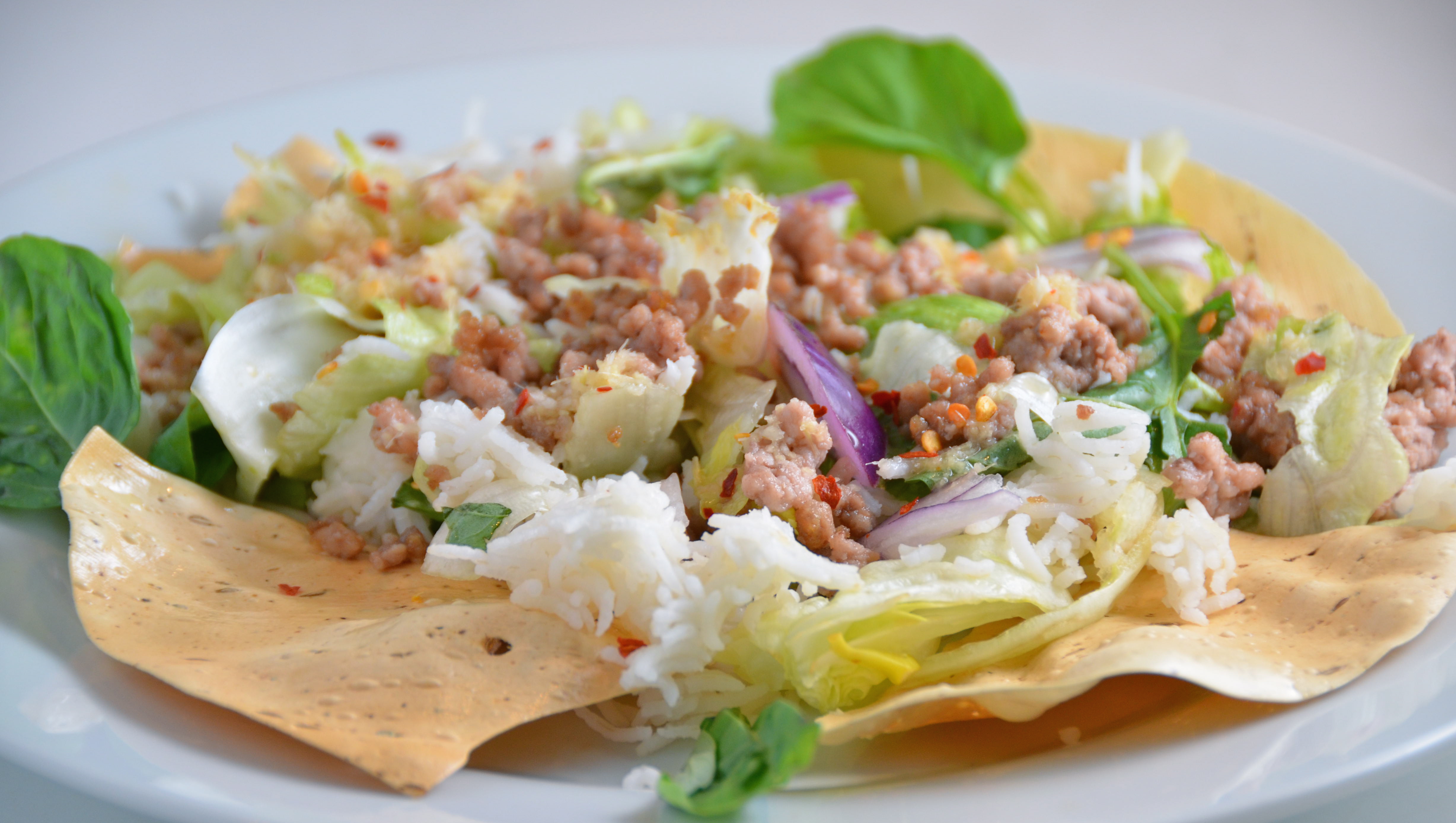 Try this fresh and fast Thai-Style Salad. Crisp lettuce topped with herbs, onion and warm minced pork all drizzled with a fragrant, spicy-sweet dressing and nutty toasted rice powder. Light and lovely.