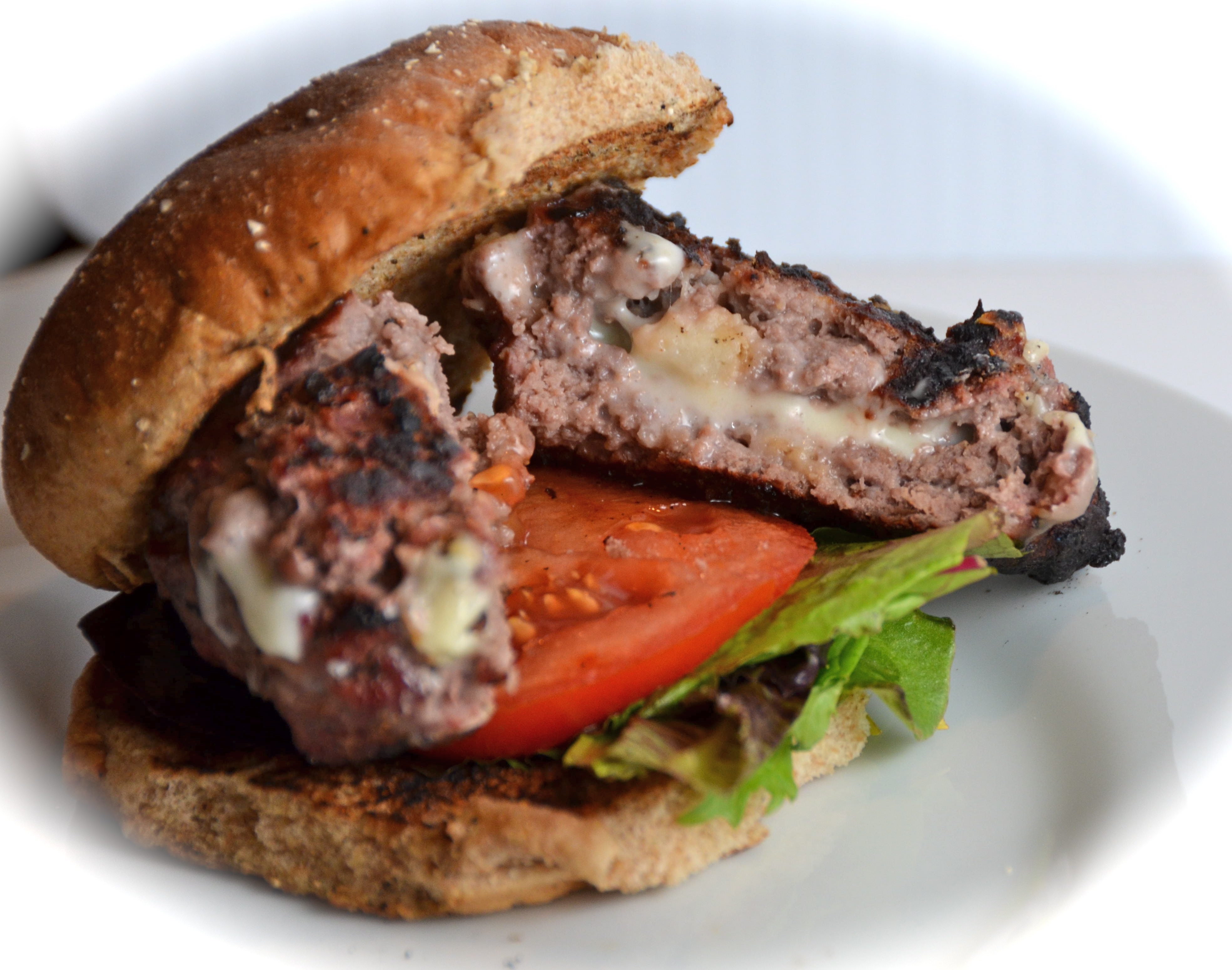 Nothing boring about these Cheeseburgers which have the cheese all sealed up inside. I love the use of mashed bread in the burgers, which gives them great texture. Then there is that first bite and all that cheese oozing out. Yum.