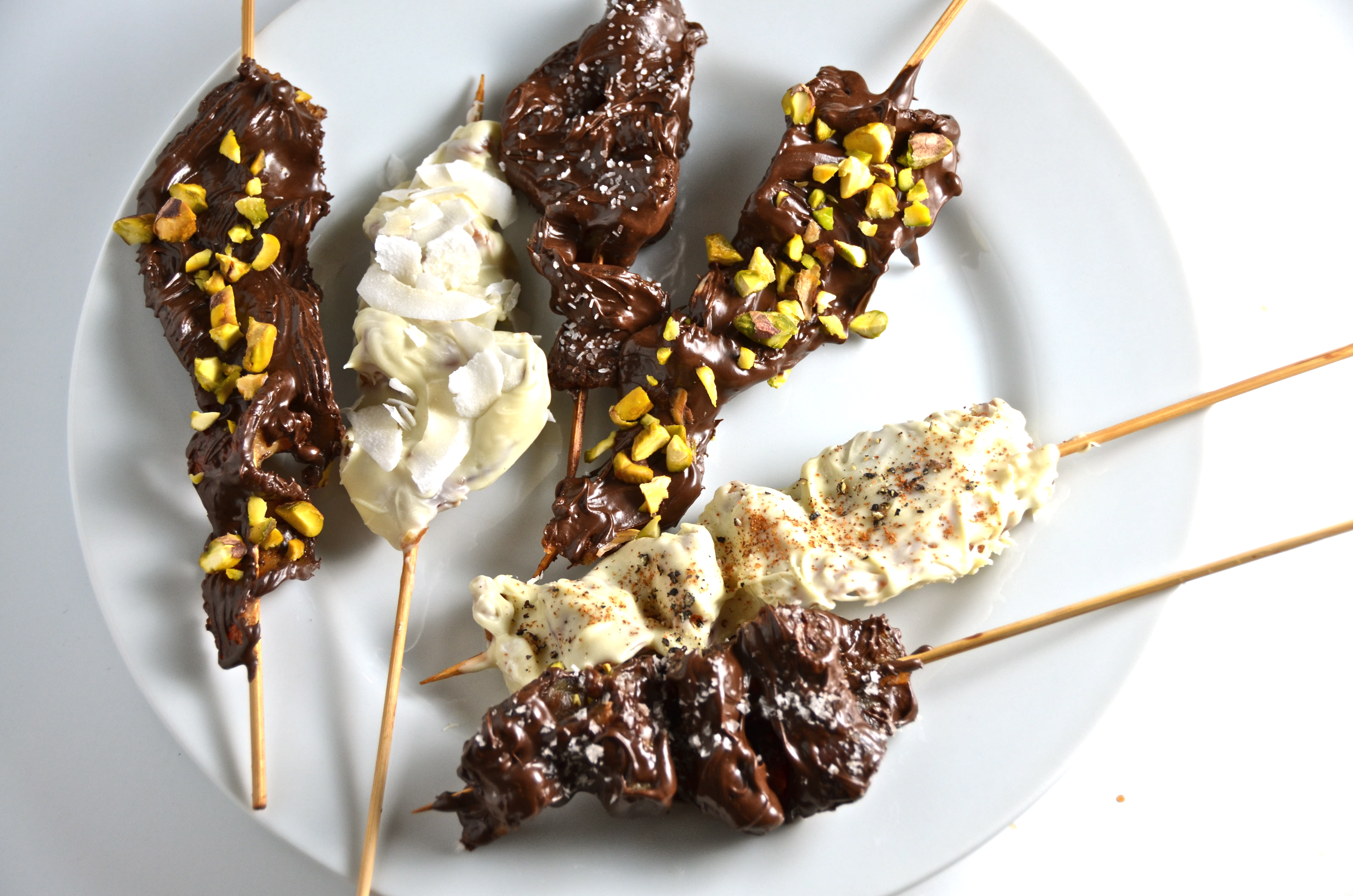 Crisp up some smoky, thick bacon skewers. Dip in sweet chocolate and sprinkle on your favorite toppings.