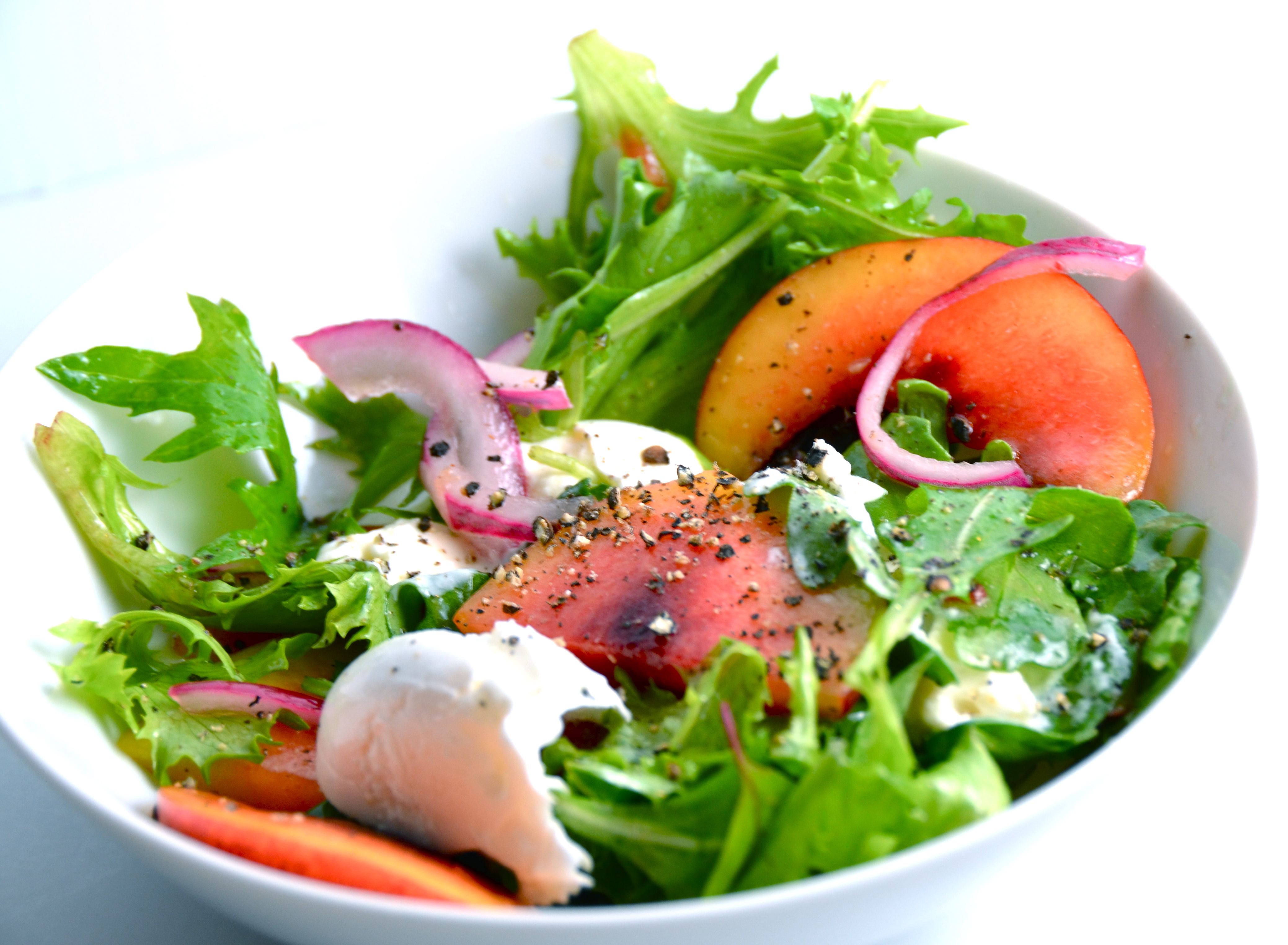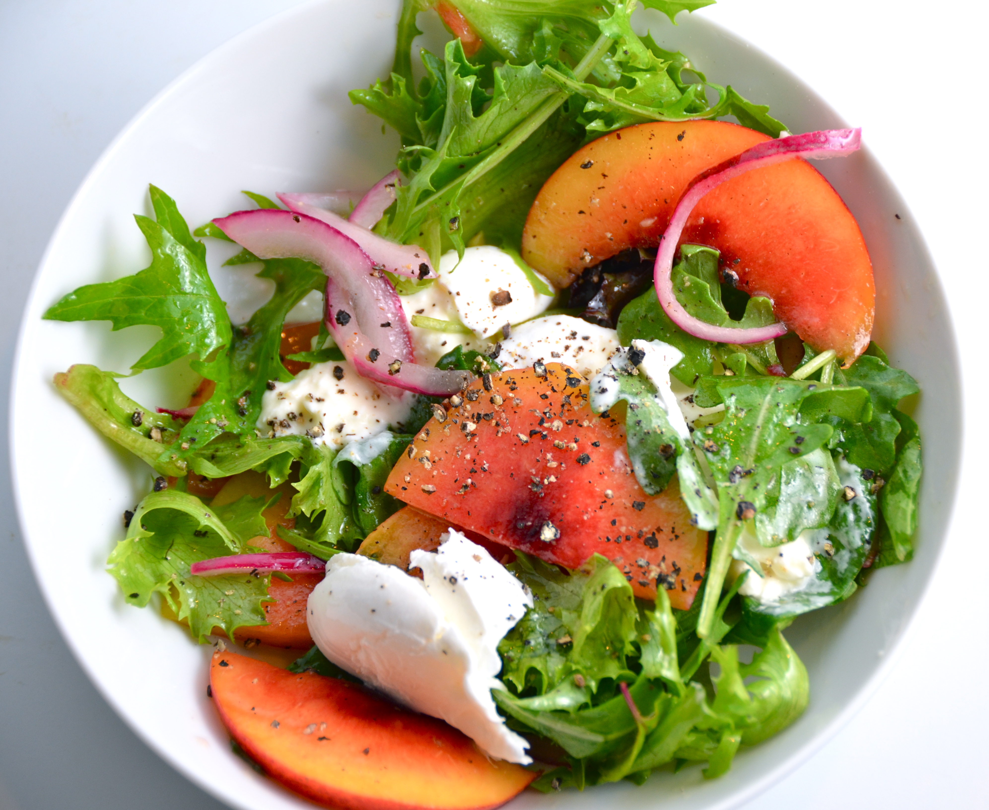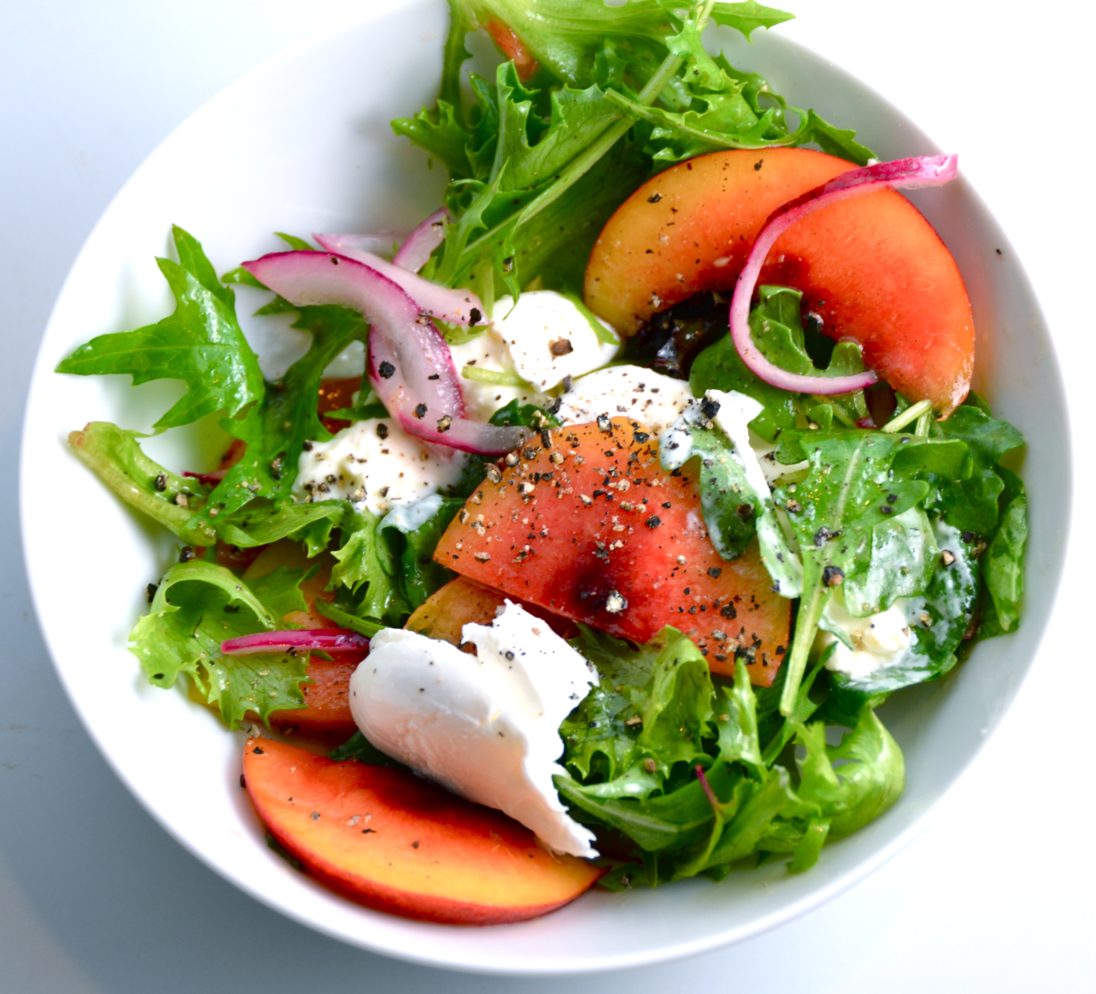 Oh my! What a bunch of tantalizing flavors and textures. The nectarines are exquisite with their ripe sweetness given the pickle treatment. Peppery greens, cool mint and the dreamy, creamy burrata round things out. Fantastic.