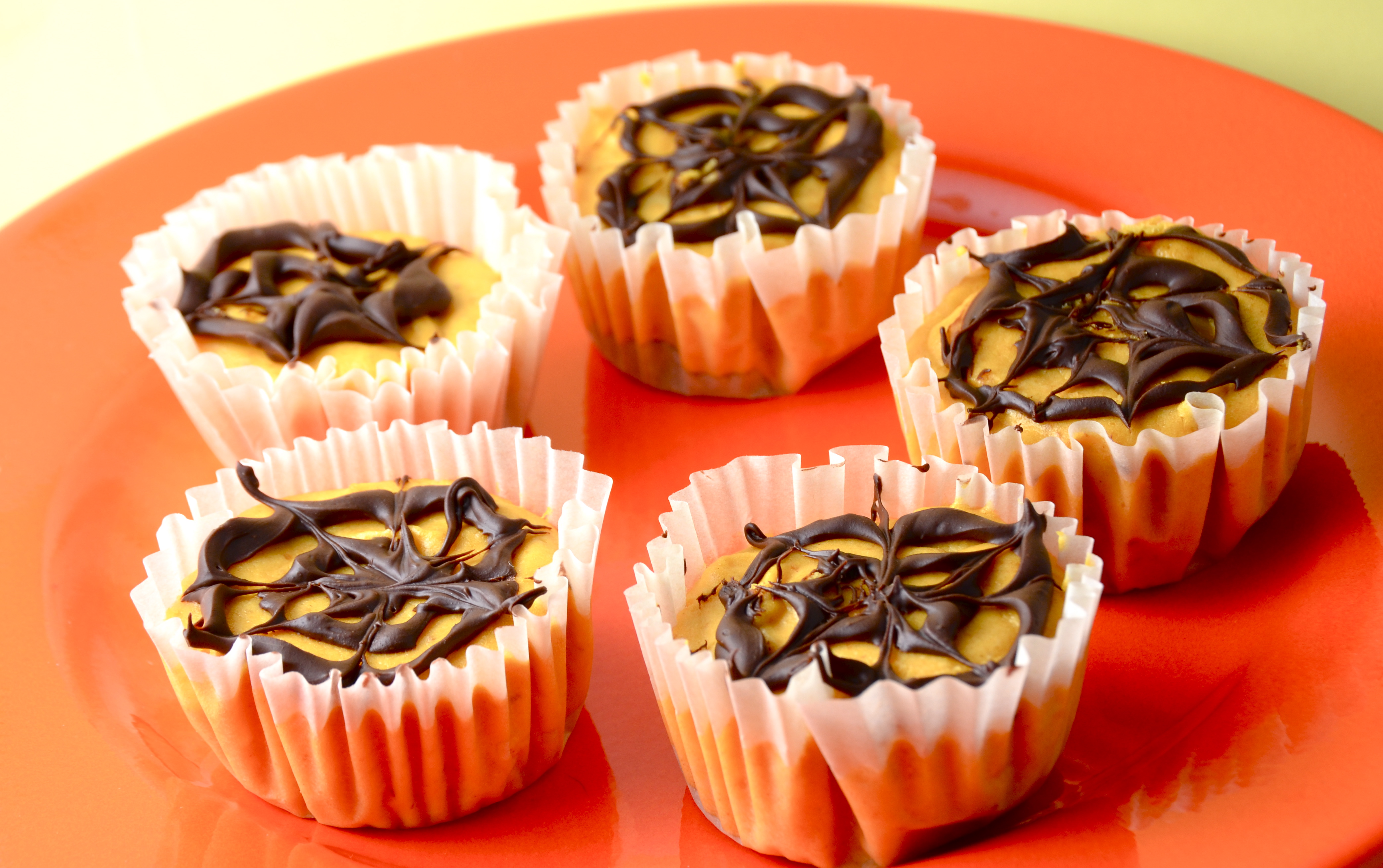 5. Microwave chocolate chips until completely melted, about 2 minutes. Spoon chocolate into a piping bag with a small round tip. Pipe melted chocolate in concentric circles on top of cheesecakes. Drag the end of a toothpick through the chocolate to create the spider webs. Refrigerate until ready to serve.
