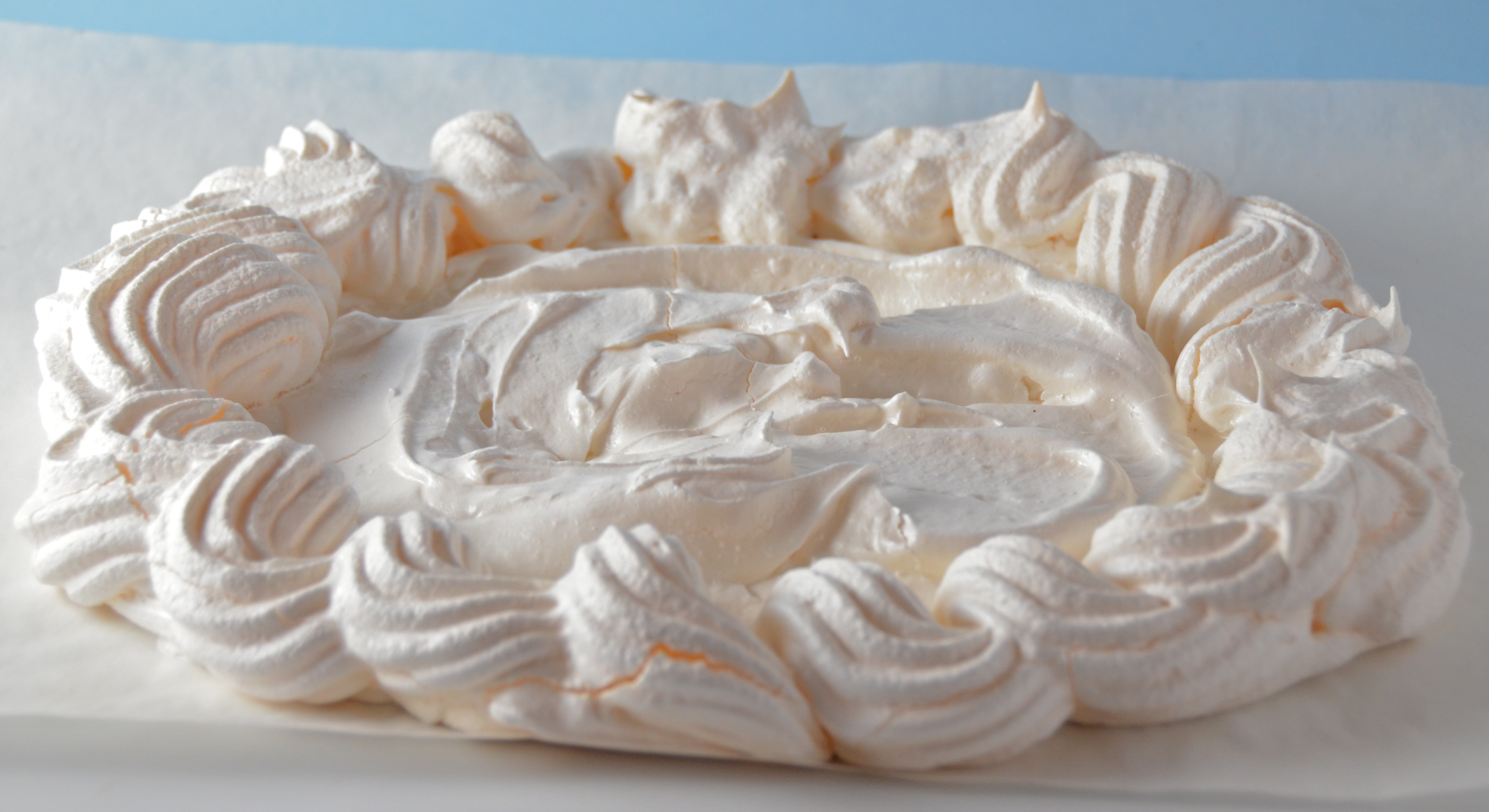 6. Transfer Pavlova to a serving plate. Top with cream, berries and confectioners’ sugar.
