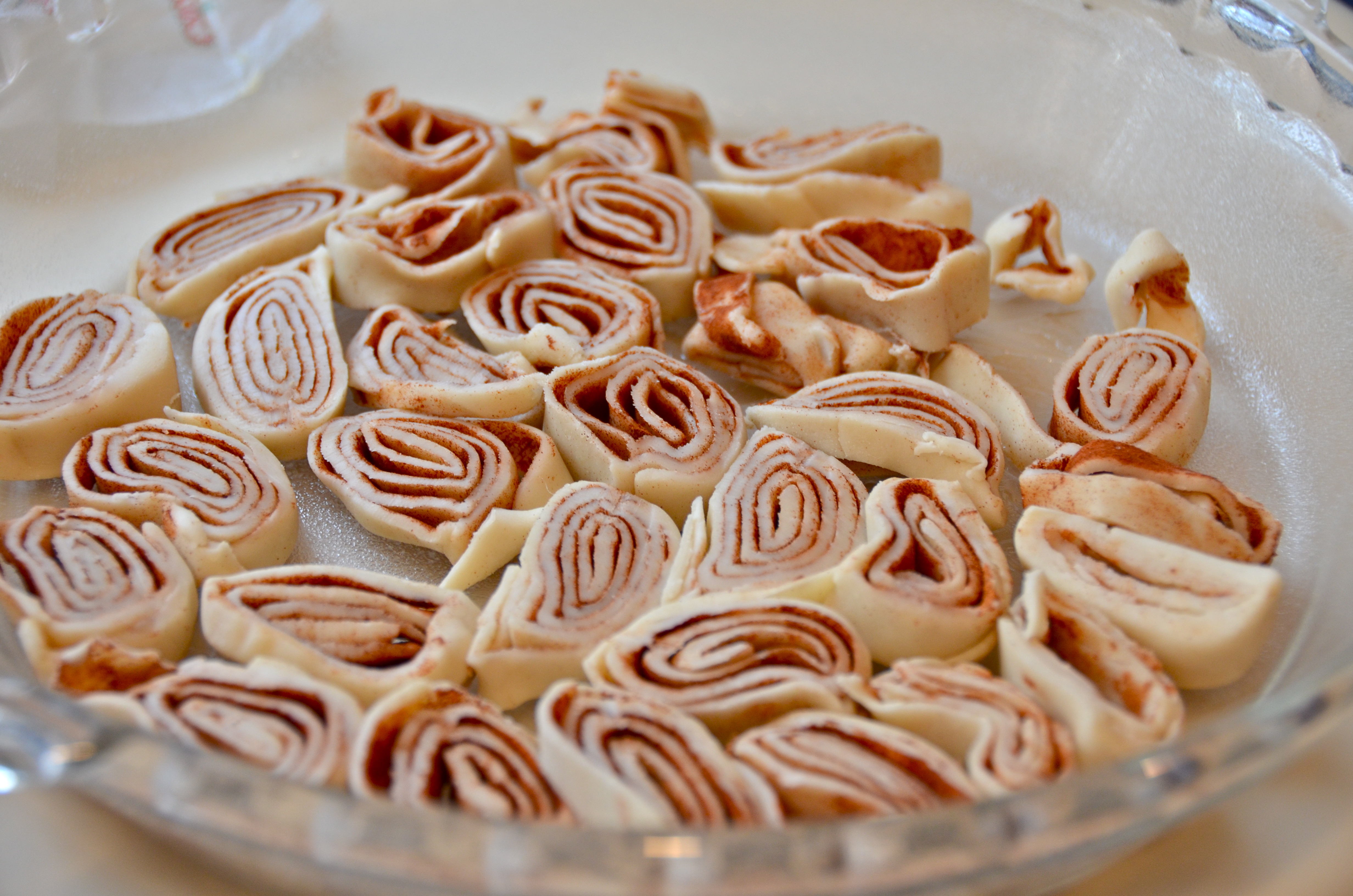 6. Grease a 9-inch pie plate. Arrange the cinnamon bun dough rounds in the pan so that they are touching each other. Flatten the dough with your fingers until the pie plate is covered, without gaps, in an even thickness.
