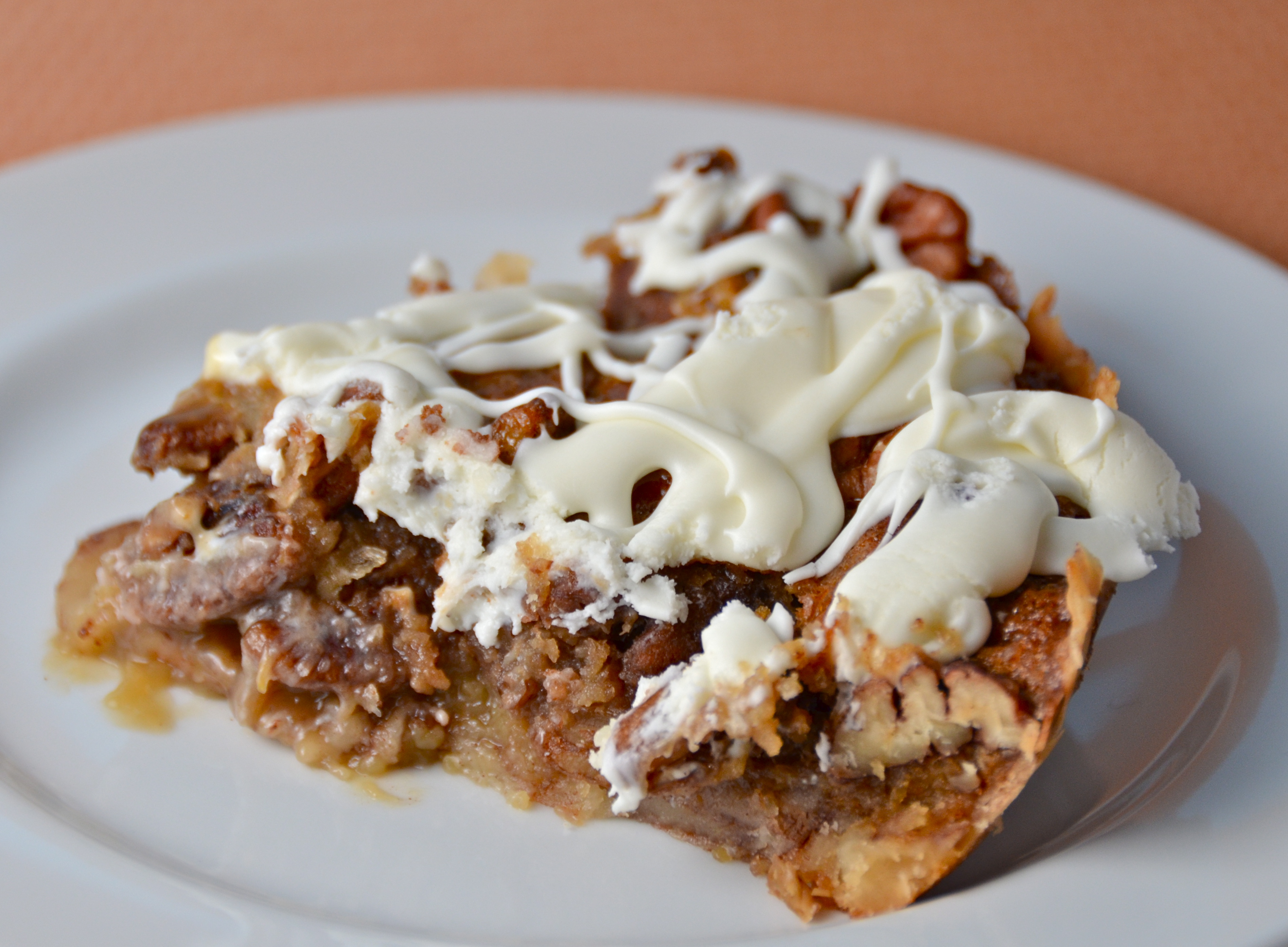 This genius pecan pie has a cinnamon bun crust and a generous cream cheese drizzle. It really tastes like a cinnamon roll!