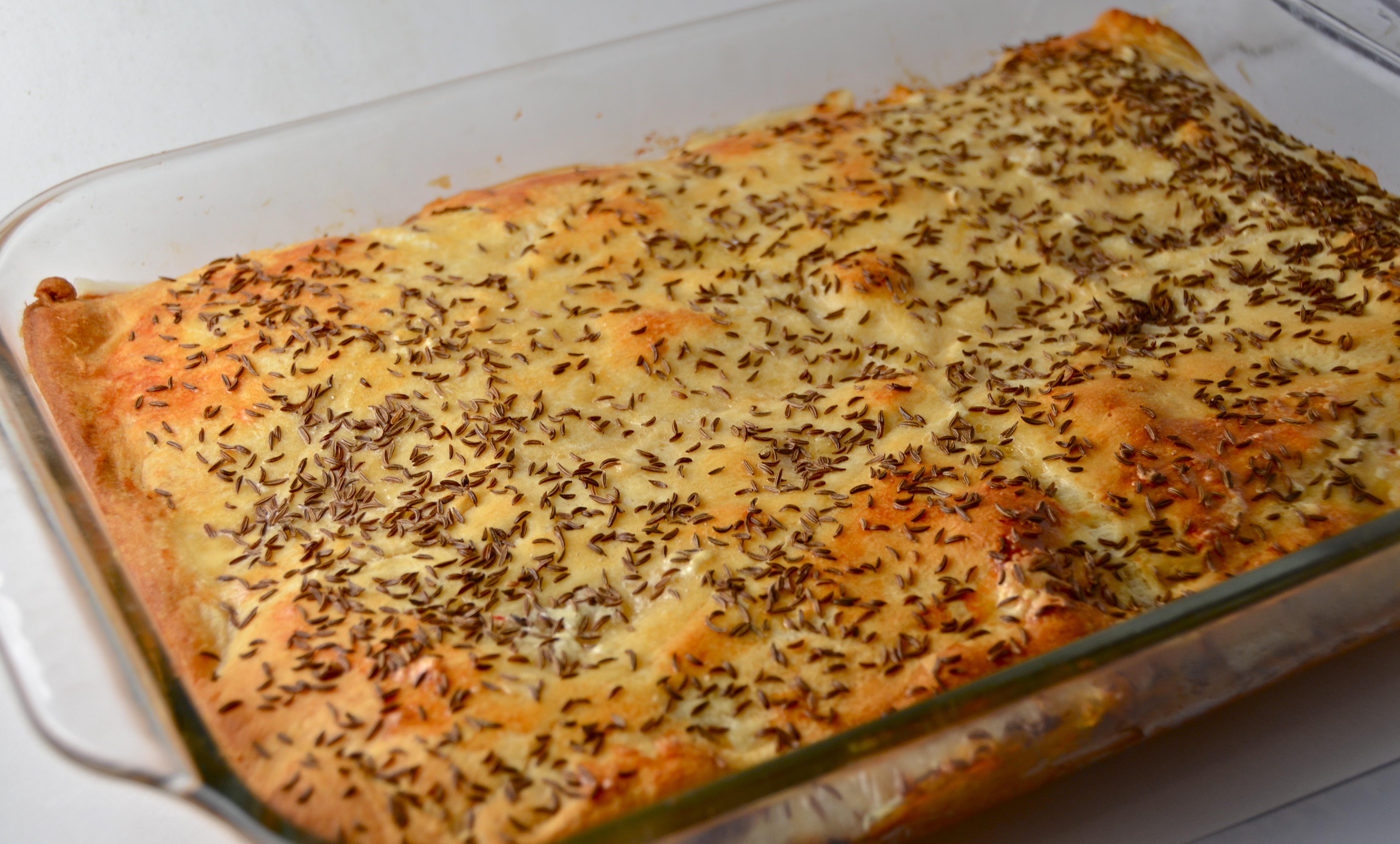 and perforations. Place over top of casserole. Brush with egg white; sprinkle with caraway seeds.