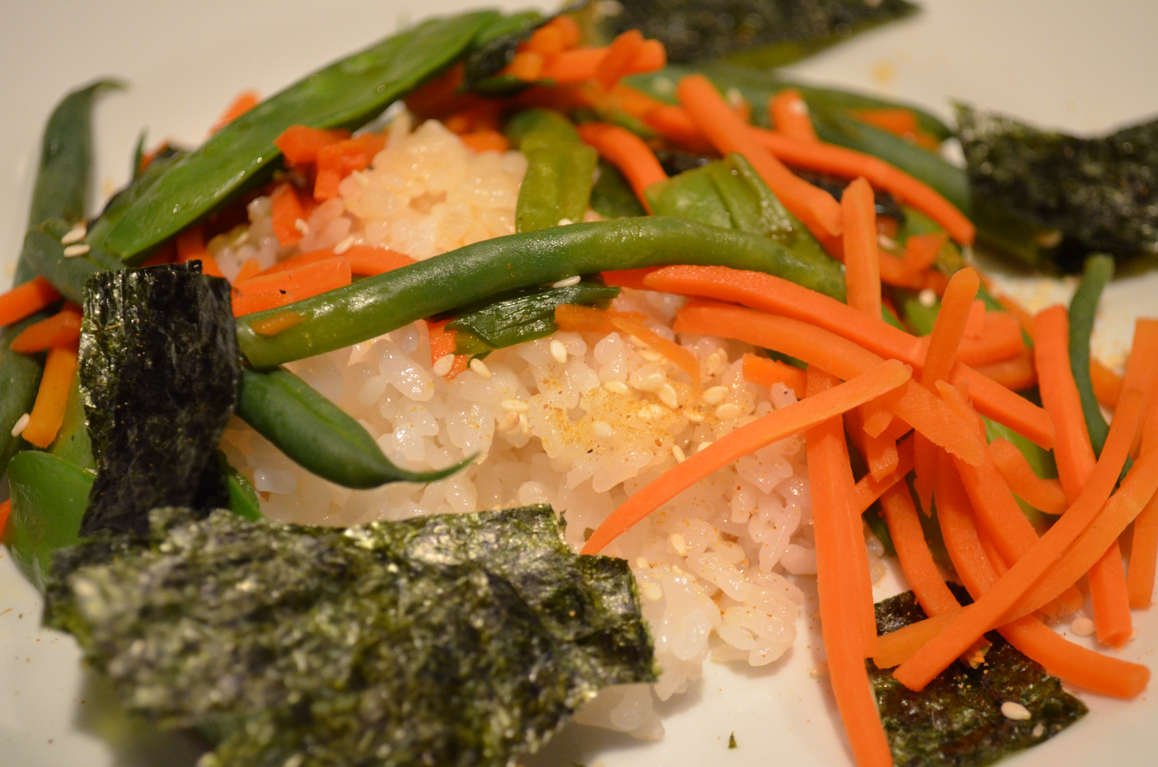 4. Divide rice between plates. Spoon vegetables on top, then snip squares of nori over. Scatter with the sesame seeds.
