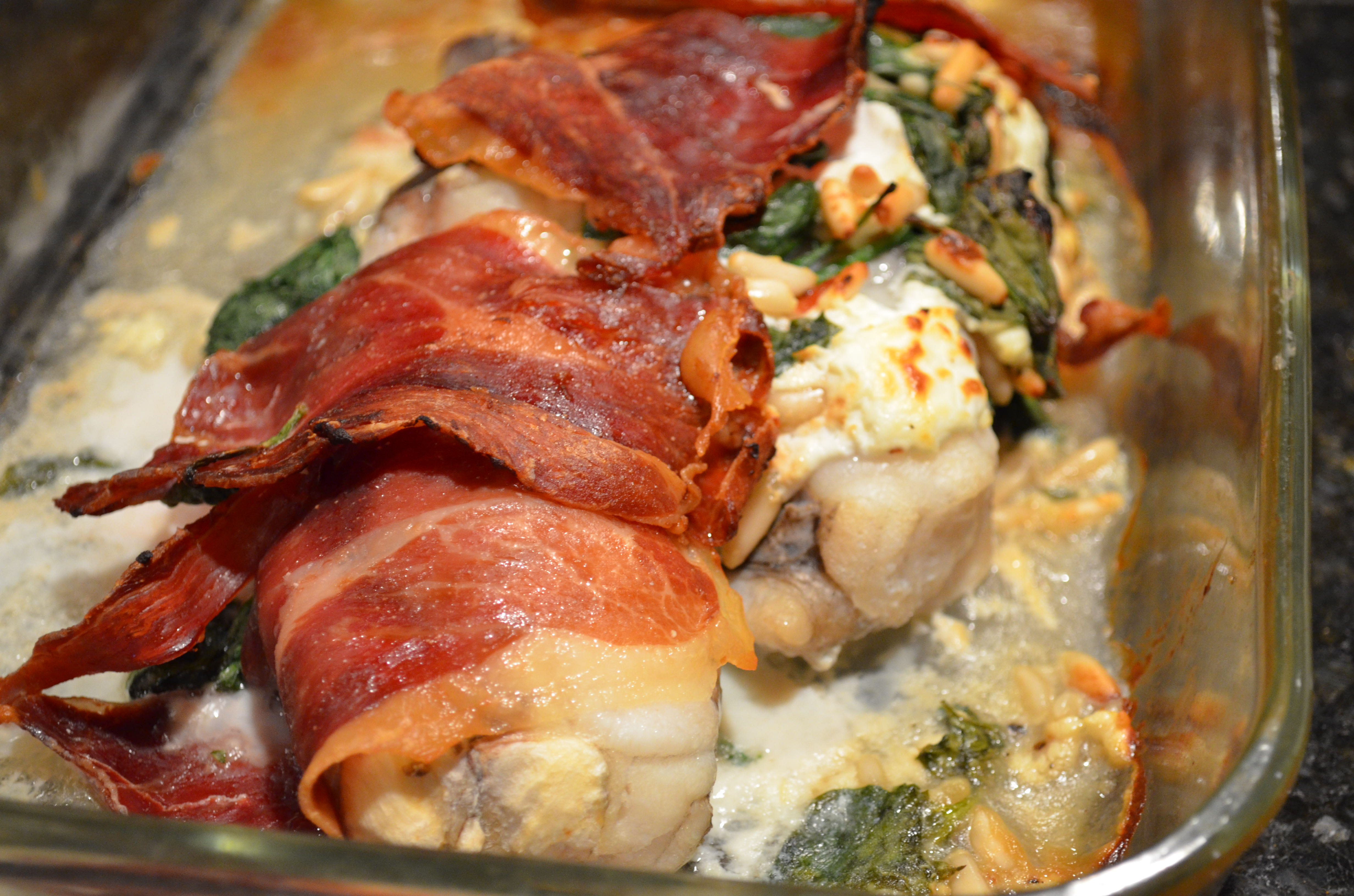 3. Place one monkfish into a greased roasting pan. Spread the spinach filling down the center. Lay the second monkfish tail on top. Lay strips of ham over the top of the monkfish.