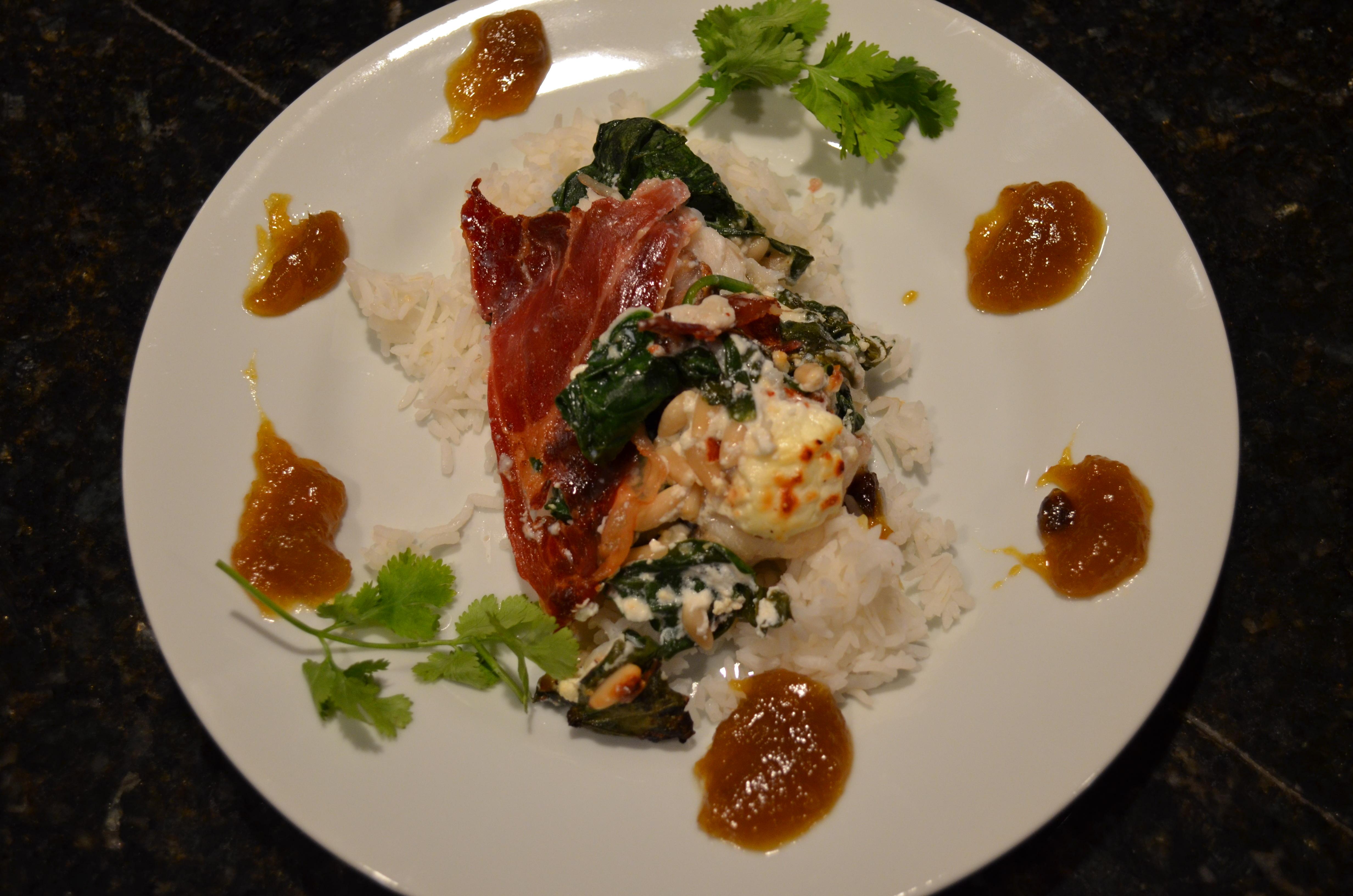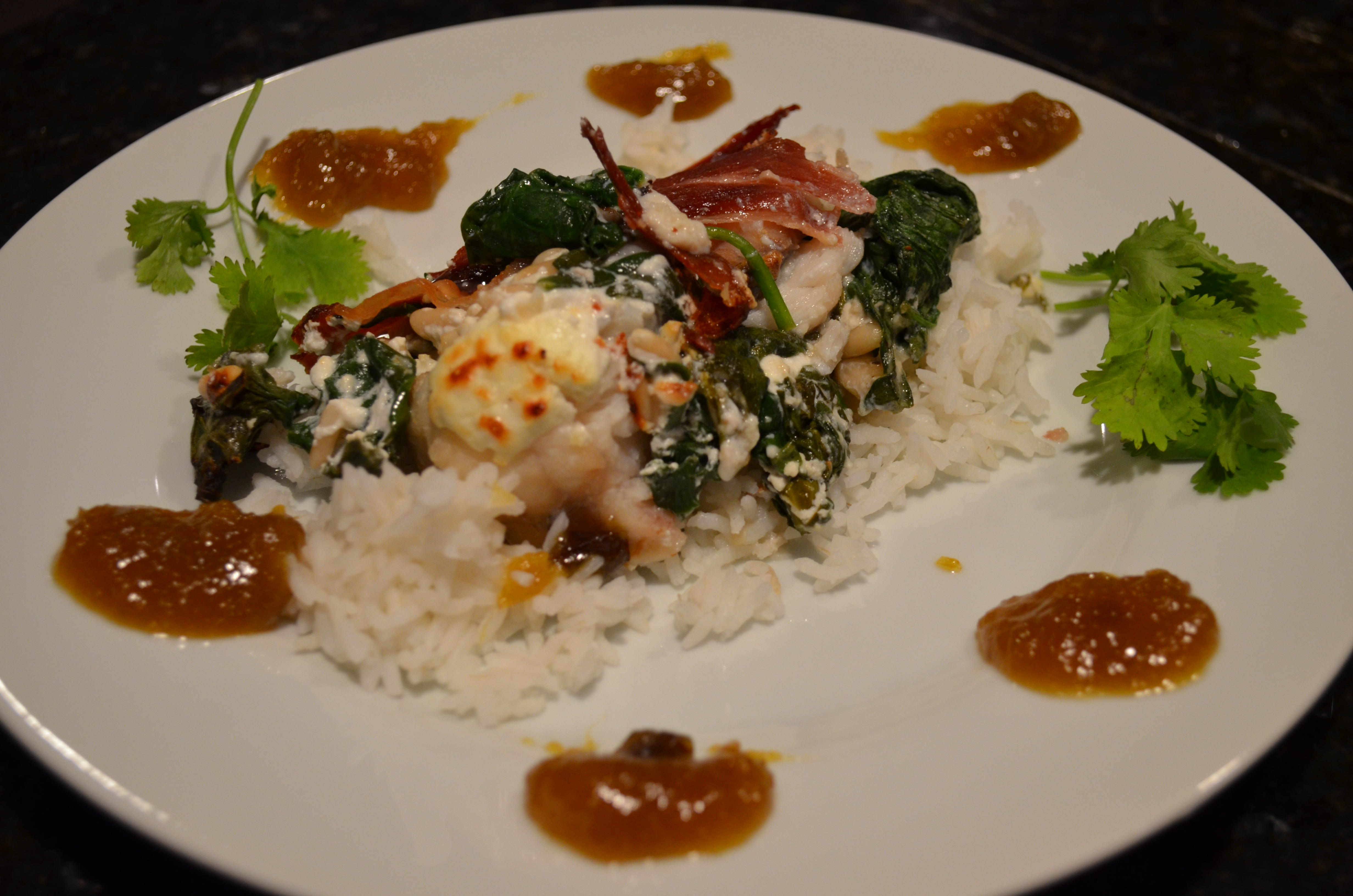 You will want to sink your jaws into this dreamy monkfish dinner. The combination of melting goat cheese and spinach is so good. The monkfish is almost like lobster in texture. Really good with the curry chutney.