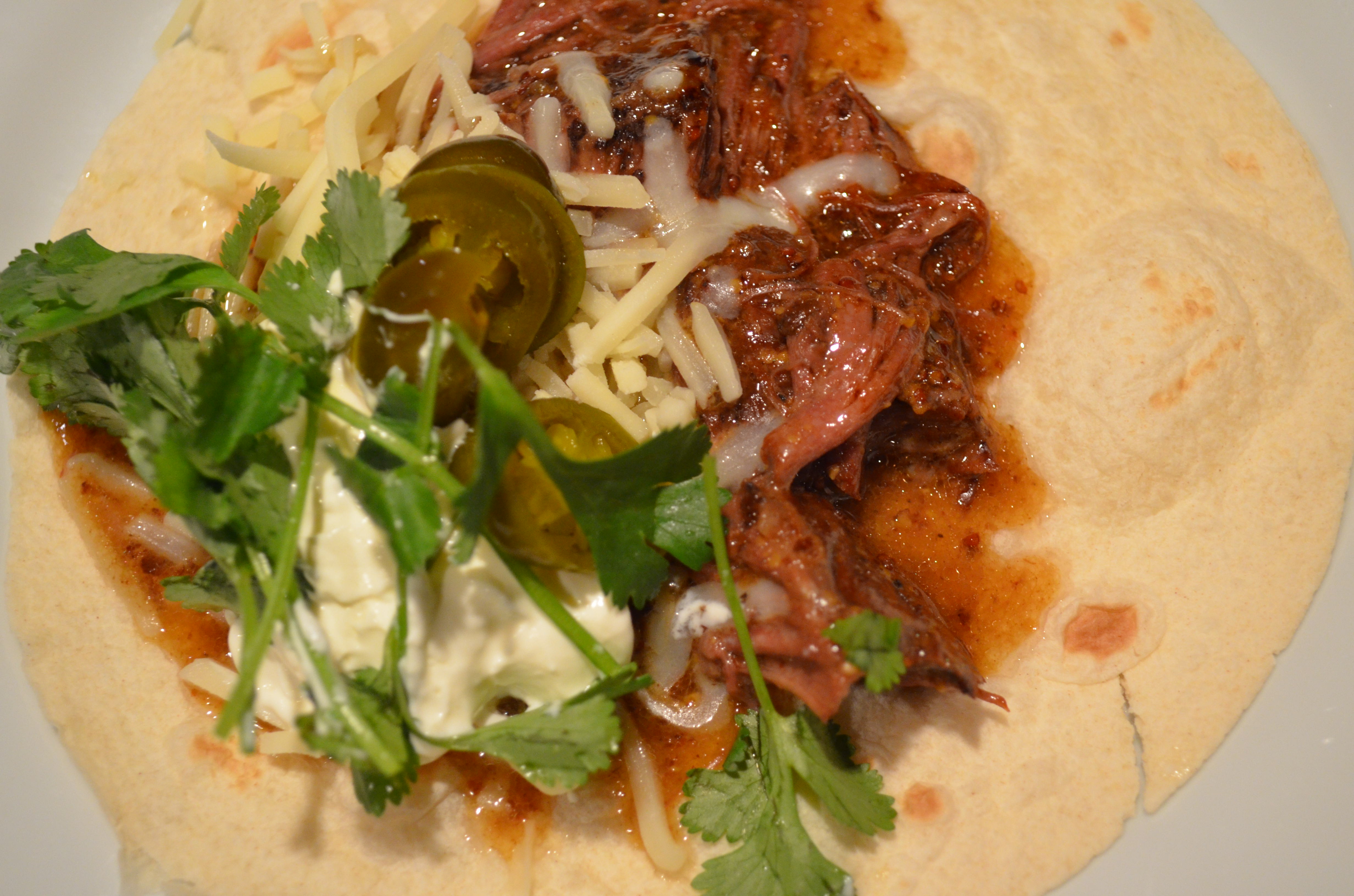 2. Cook on high for 3-4 hours. Discard the bacon fat and shred meat. Warm the tortillas and top with shredded steak and toppings of choice.