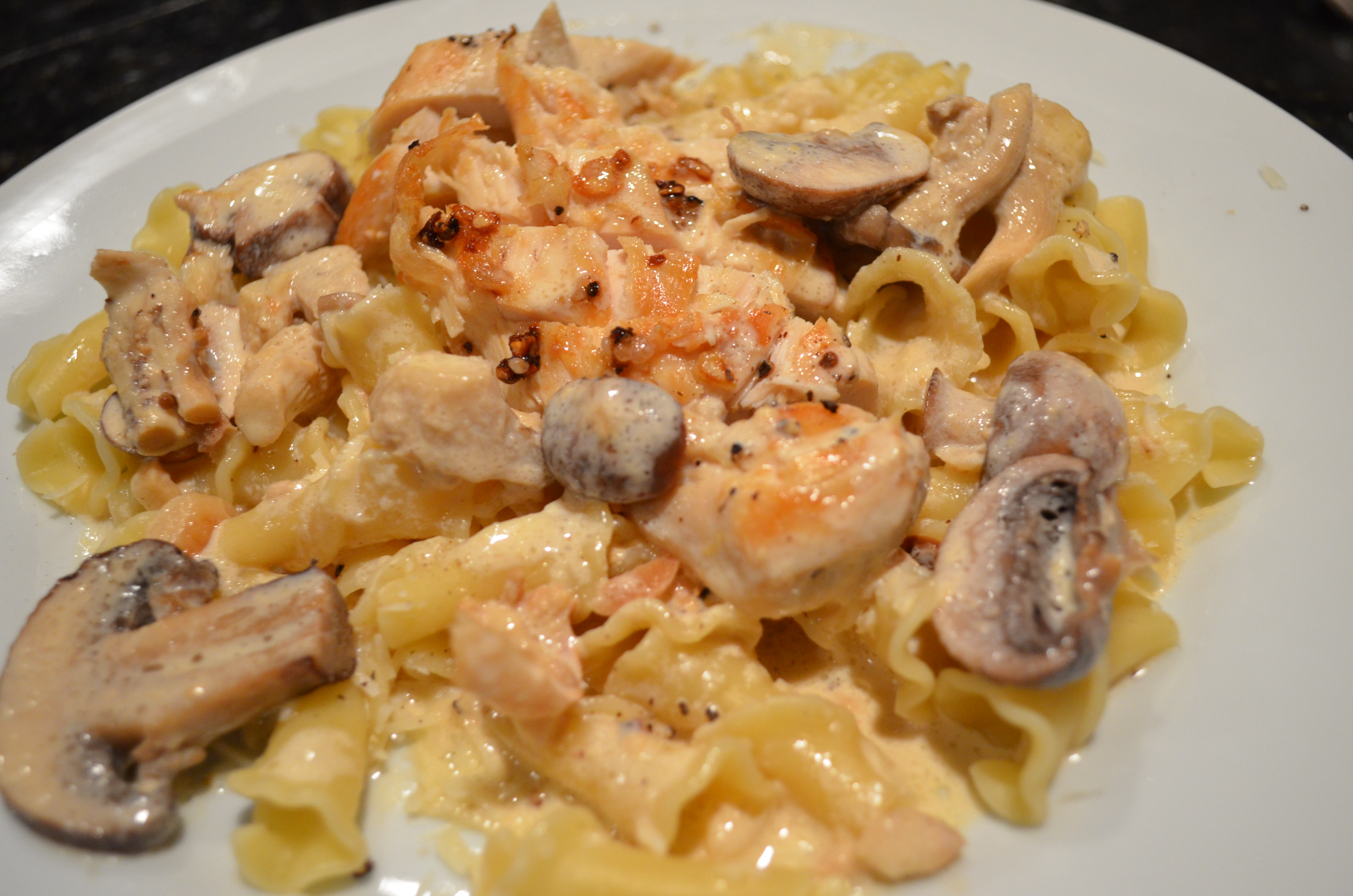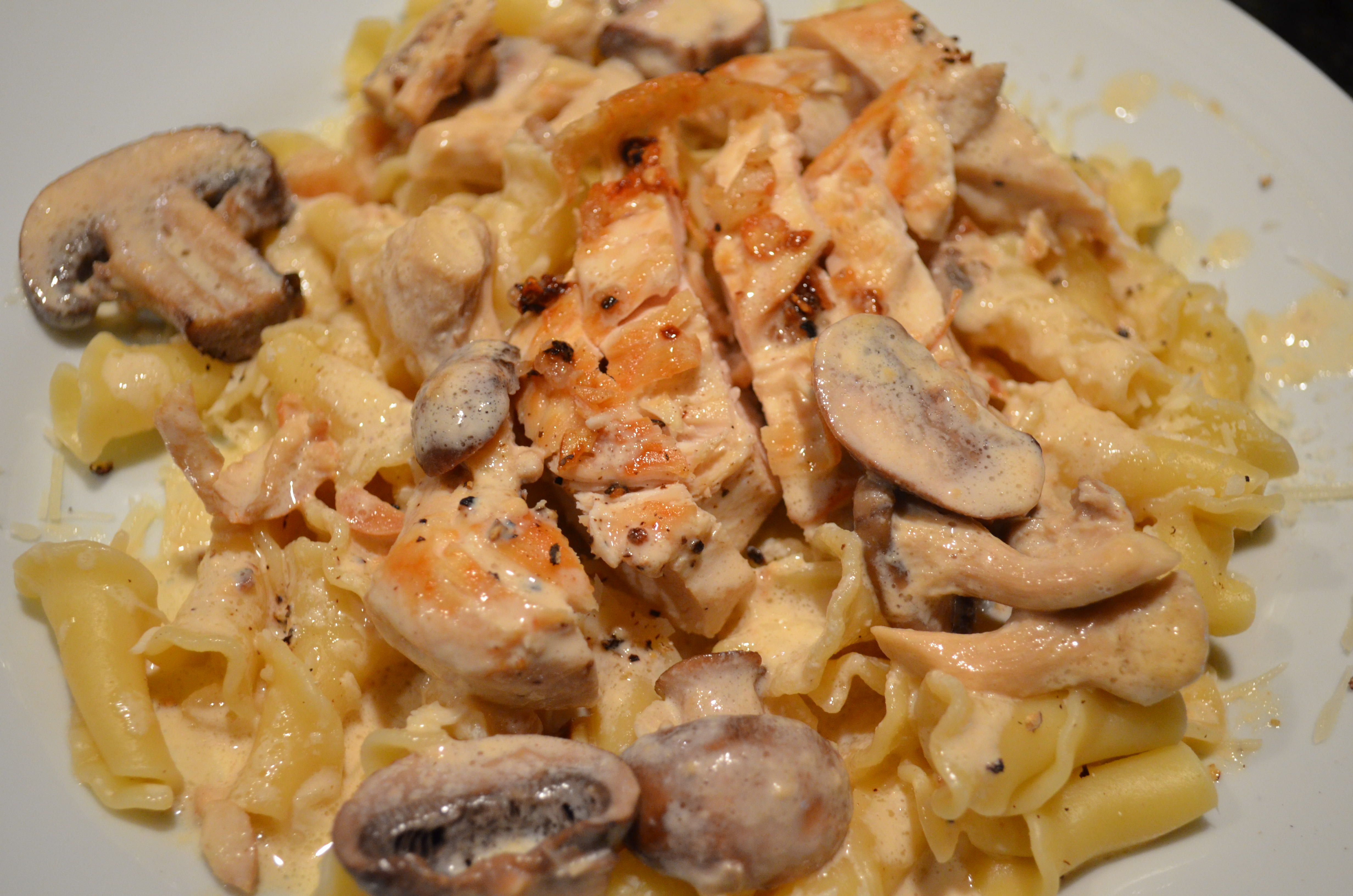3. Return chicken to the sauce, add the mushrooms and simmer for another 2 minutes. Serve over cooked pasta. Sprinkle with toasted slivered almonds.