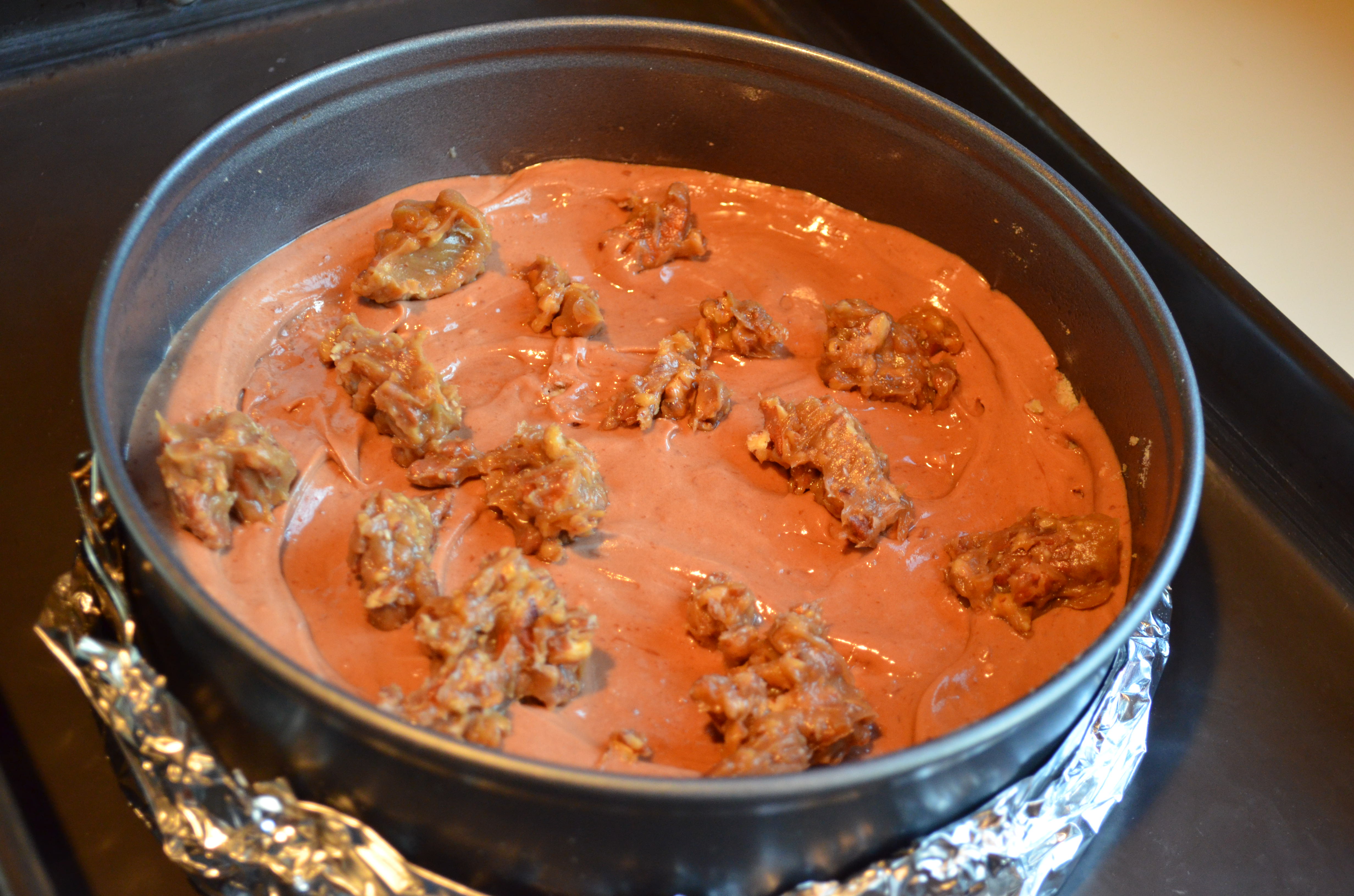 5. Combine caramel topping and remaining flour; stir in pecans. Drop by tablespoonfuls over chocolate batter. Top with remaining batter. Place springform pan in a large baking pan; add 1 in. of hot water to larger pan.