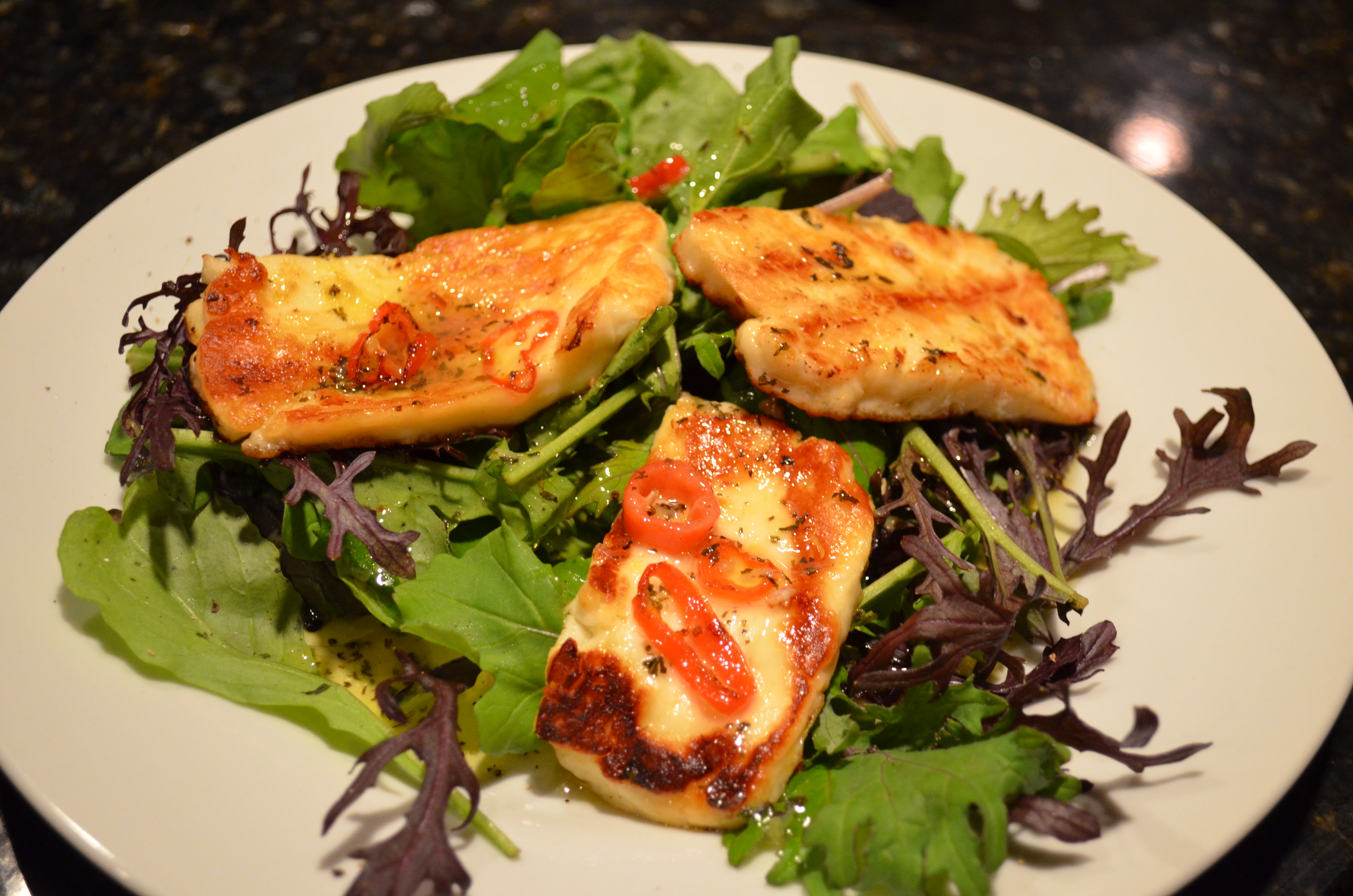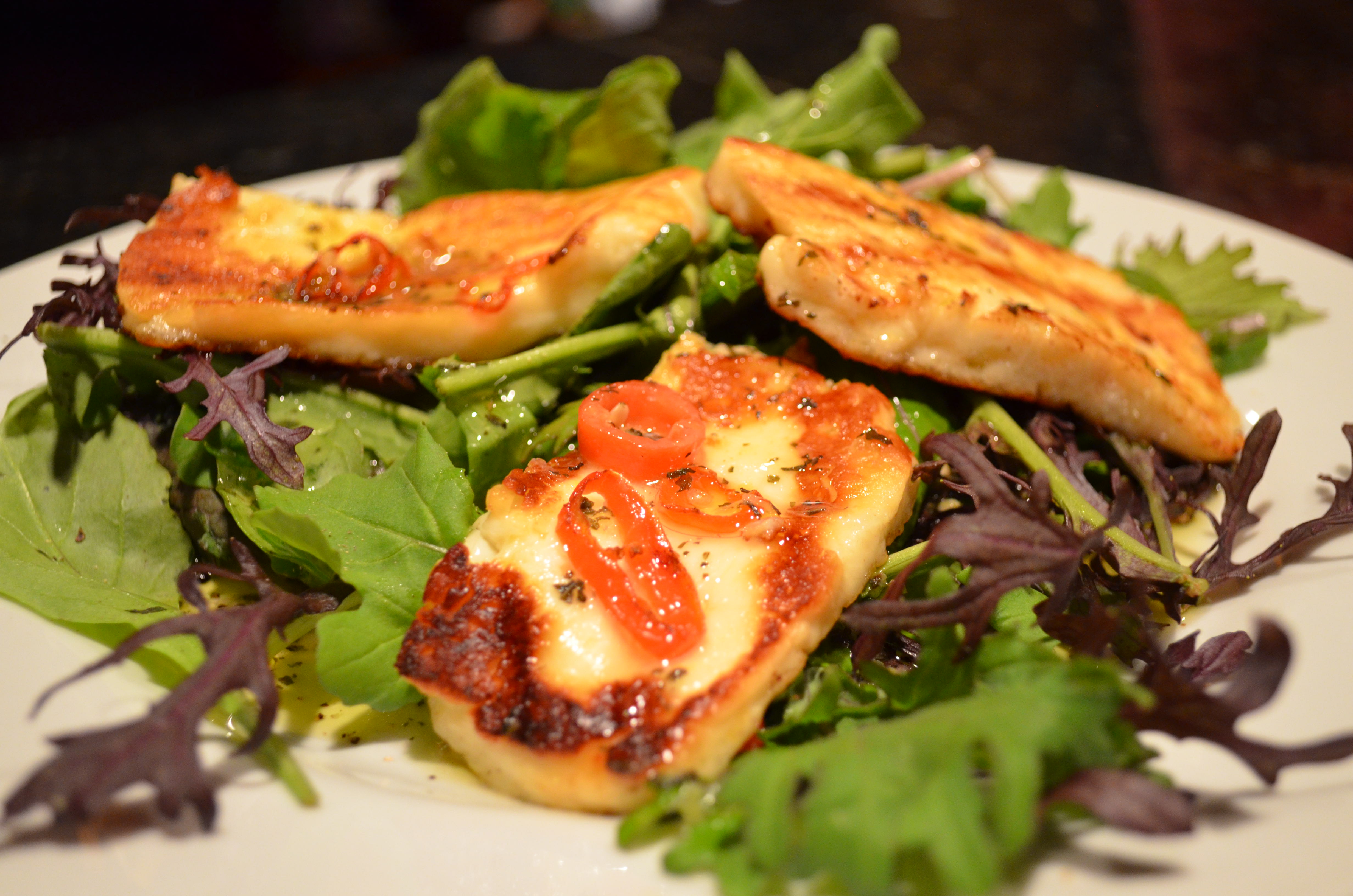 The dressing on this Halloumi is fan-freakin’-tastic. Sweet from the mint sauce, tangy from the lemon, spicy from the chiles. (Oh, about how to properly spell Chiles….this explanation came from a discussion board: