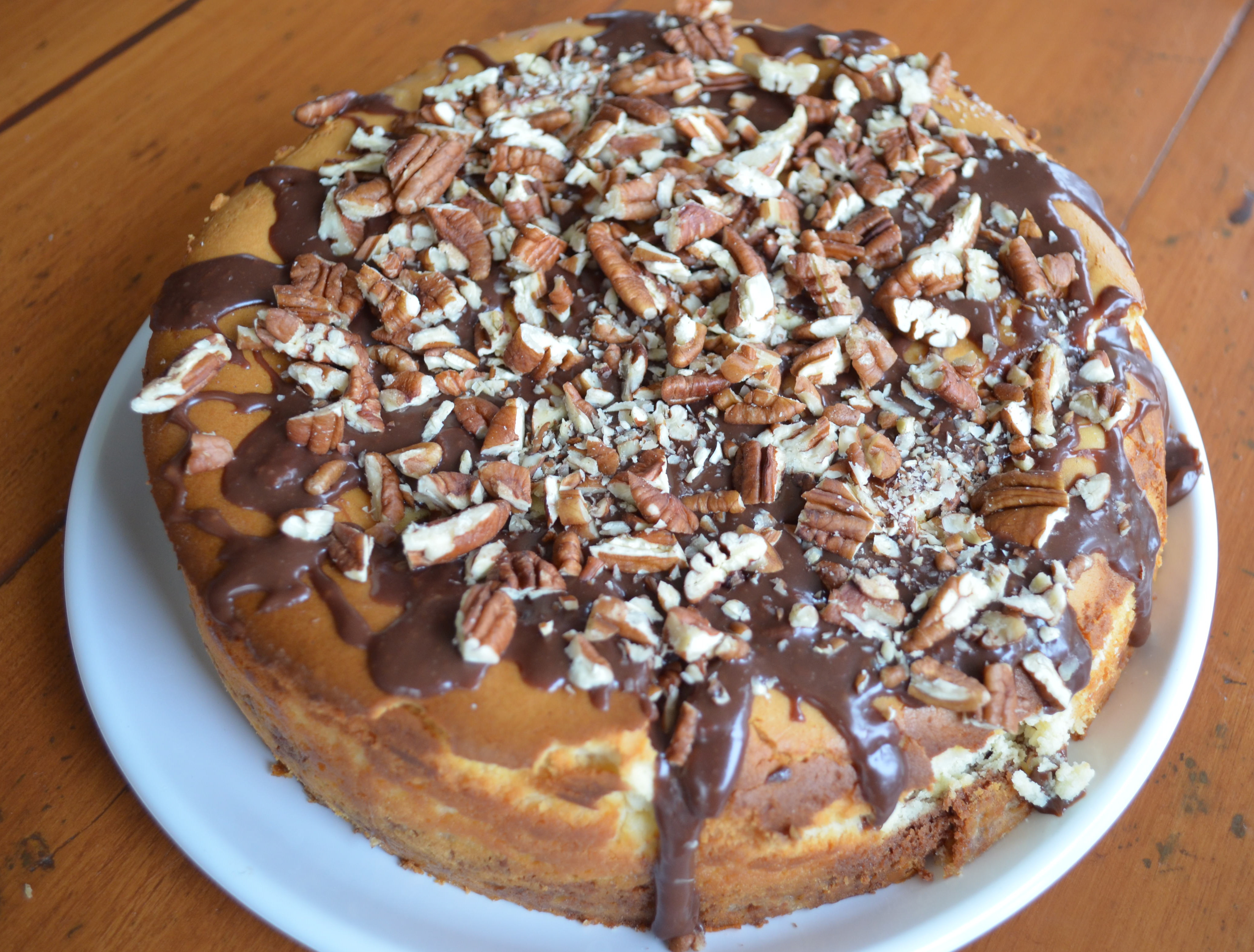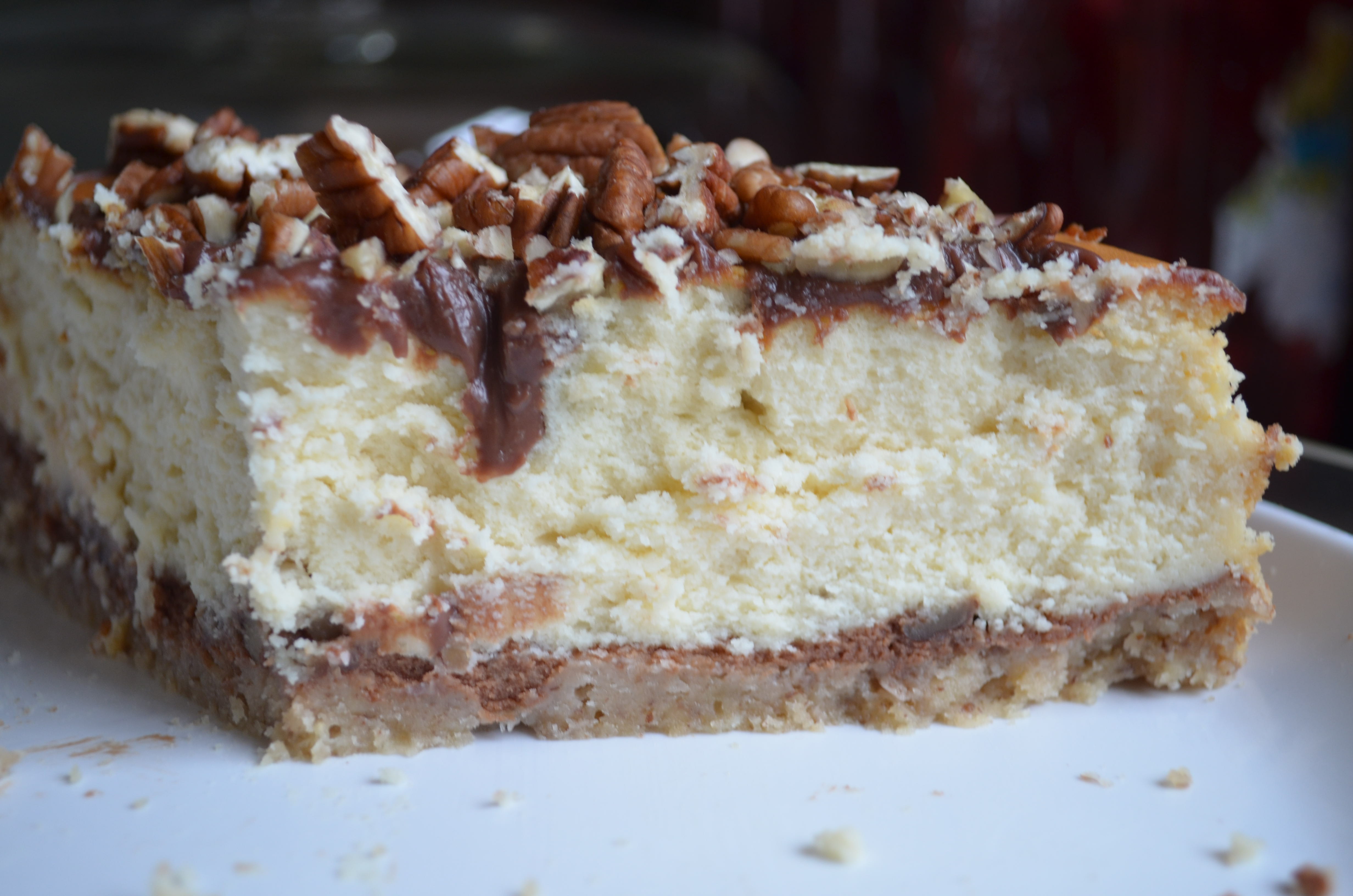 A thick brown sugar-pecan crust with a thin layer of chocolate cheesecake spread over that is dolloped with scoops of caramel coated pecans. This covered with sublime vanilla cheesecake, finally cloaked with chocolate ganache and sprinkled with more pecans and caramel.
