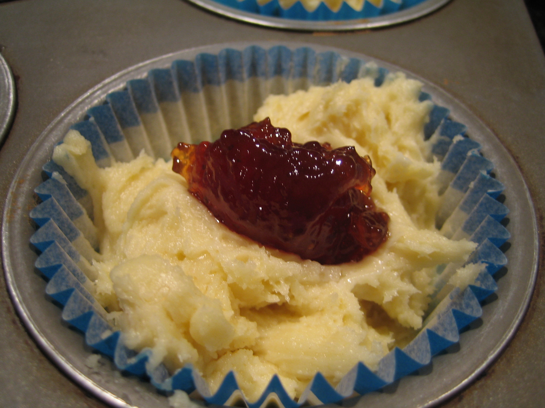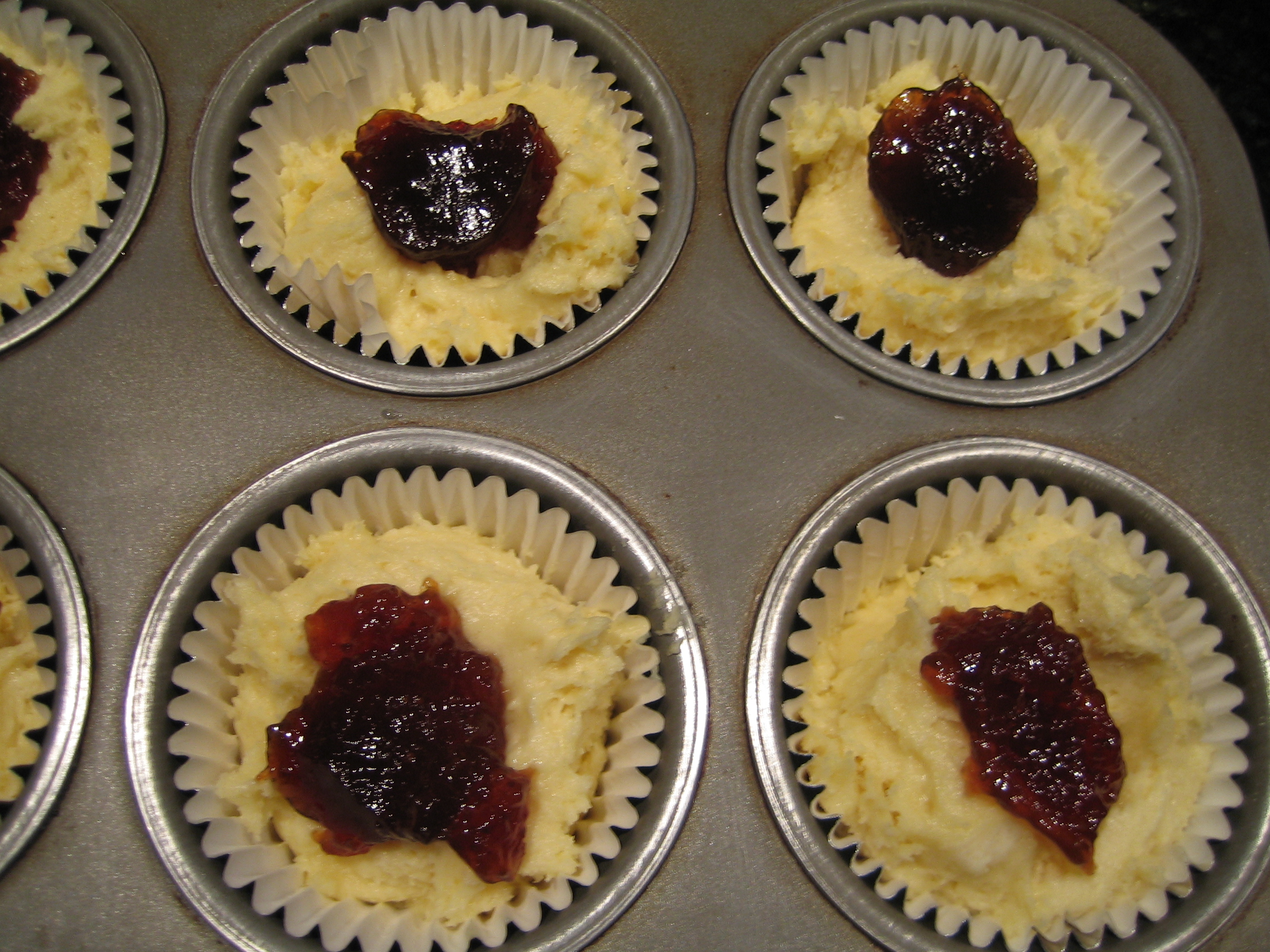 3. Line a 12-hole muffin pan with cupcake liners and fill the cases 2/3 full with batter. Make a small dip in the batter, with the back of a spoon, and fill it with 1 tsp of jam.