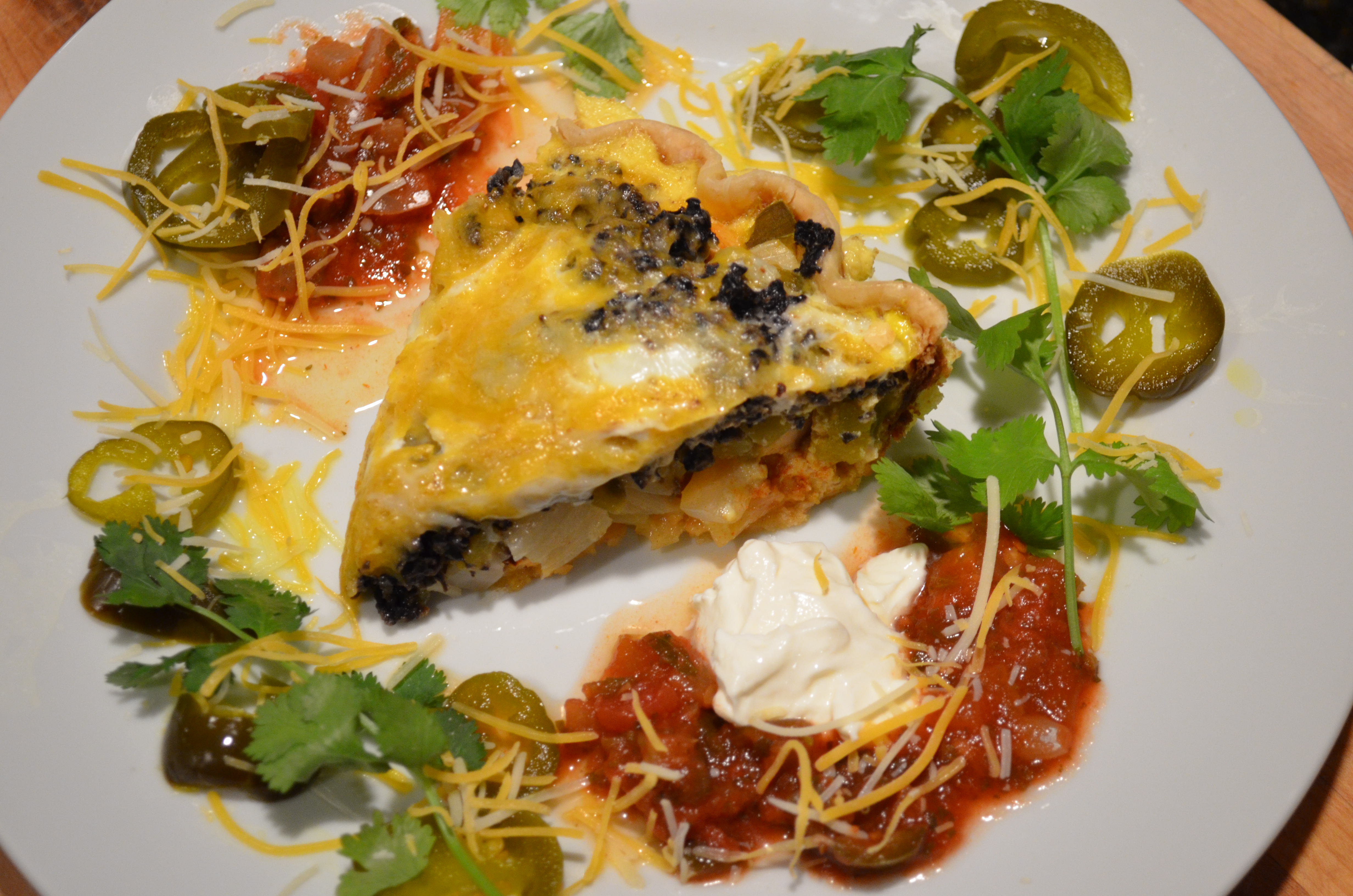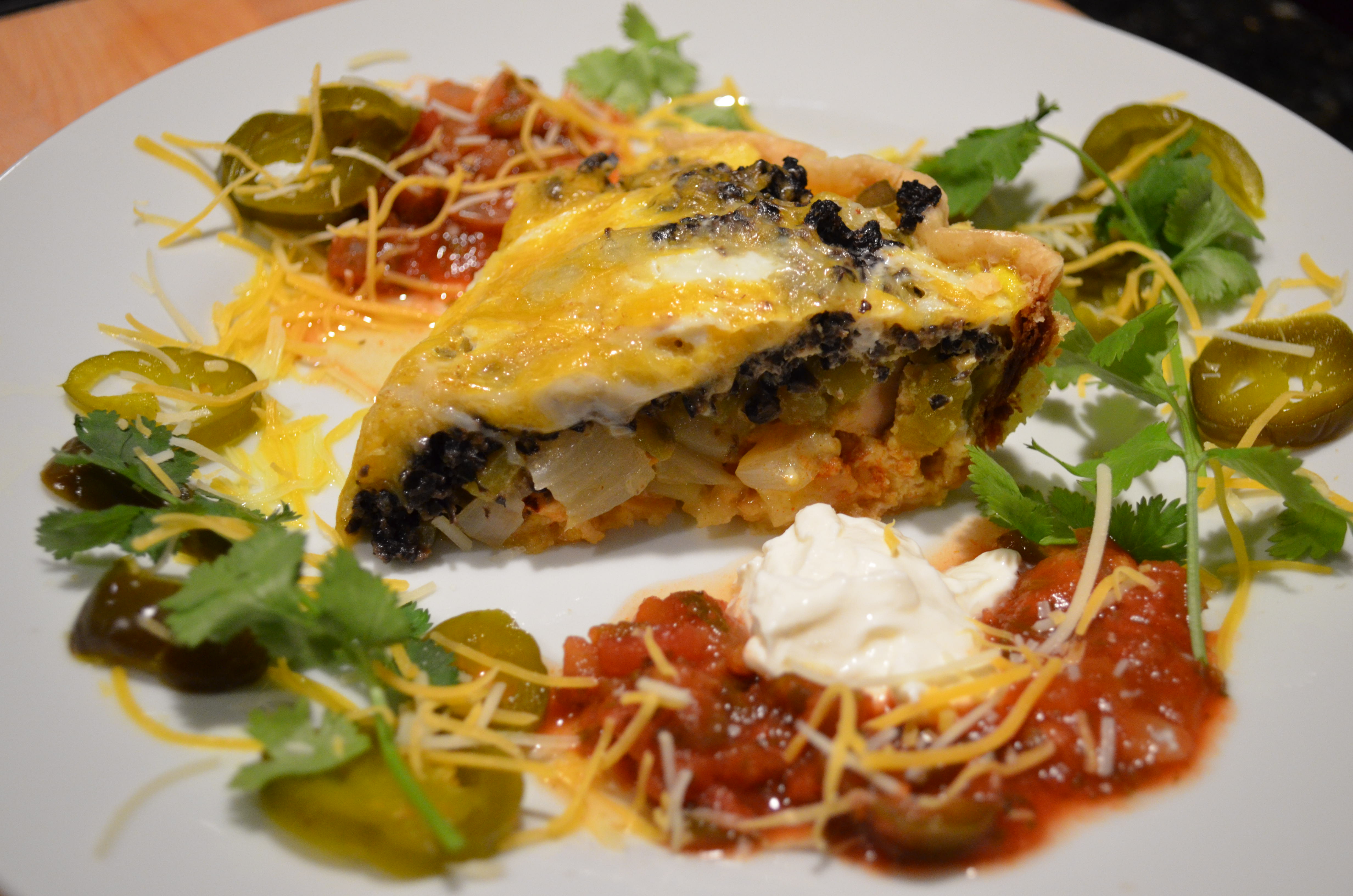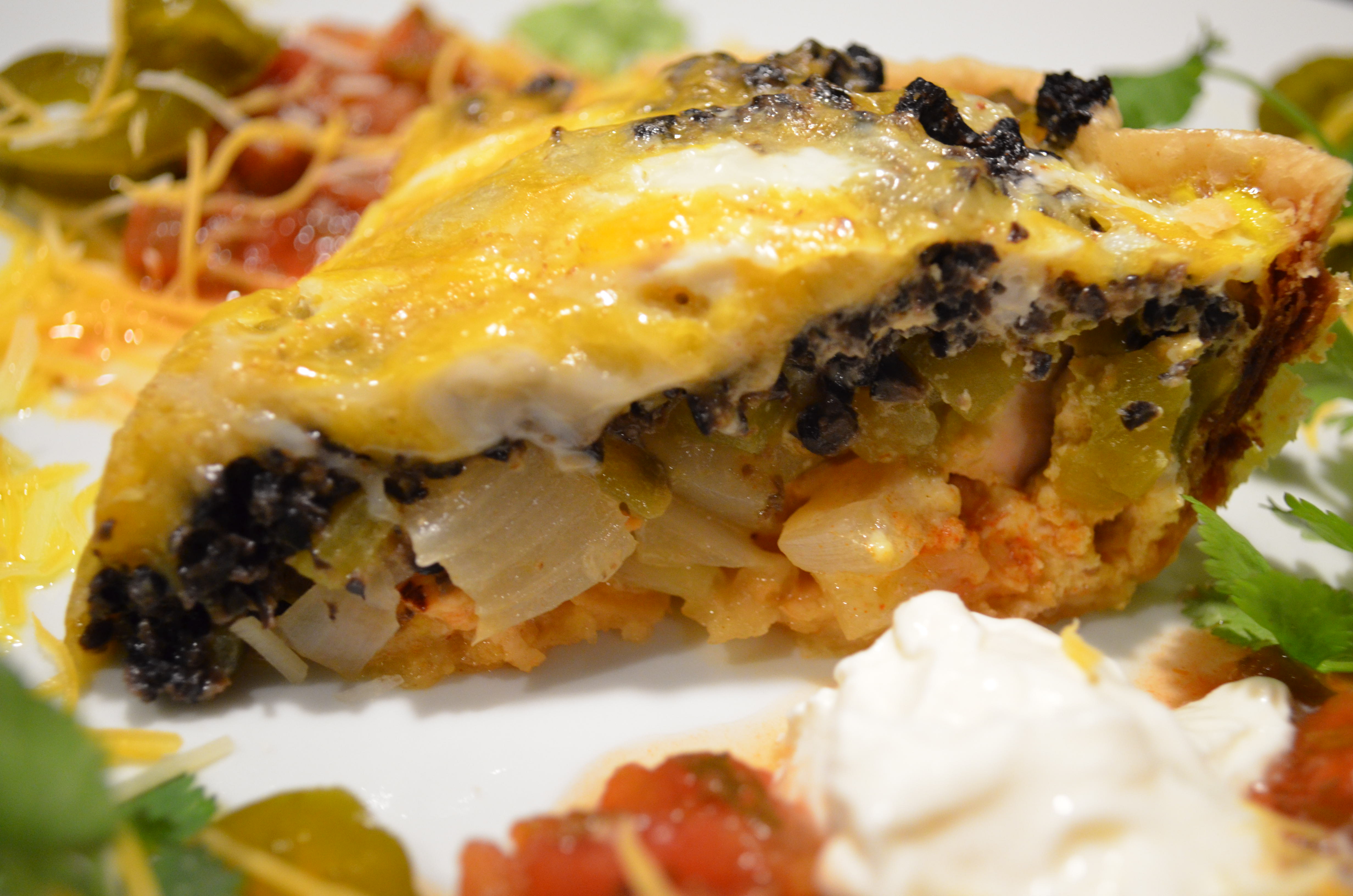 4. To assemble pie, layer chicken, cooked onions, chiles, olives and cheese in cooked pie shell. In medium bowl, combine milk, 3 eggs, cumin, garlic powder, pepper, hot pepper sauce and any remaining egg mixture; blend well. Pour mixture slowly over cheese.