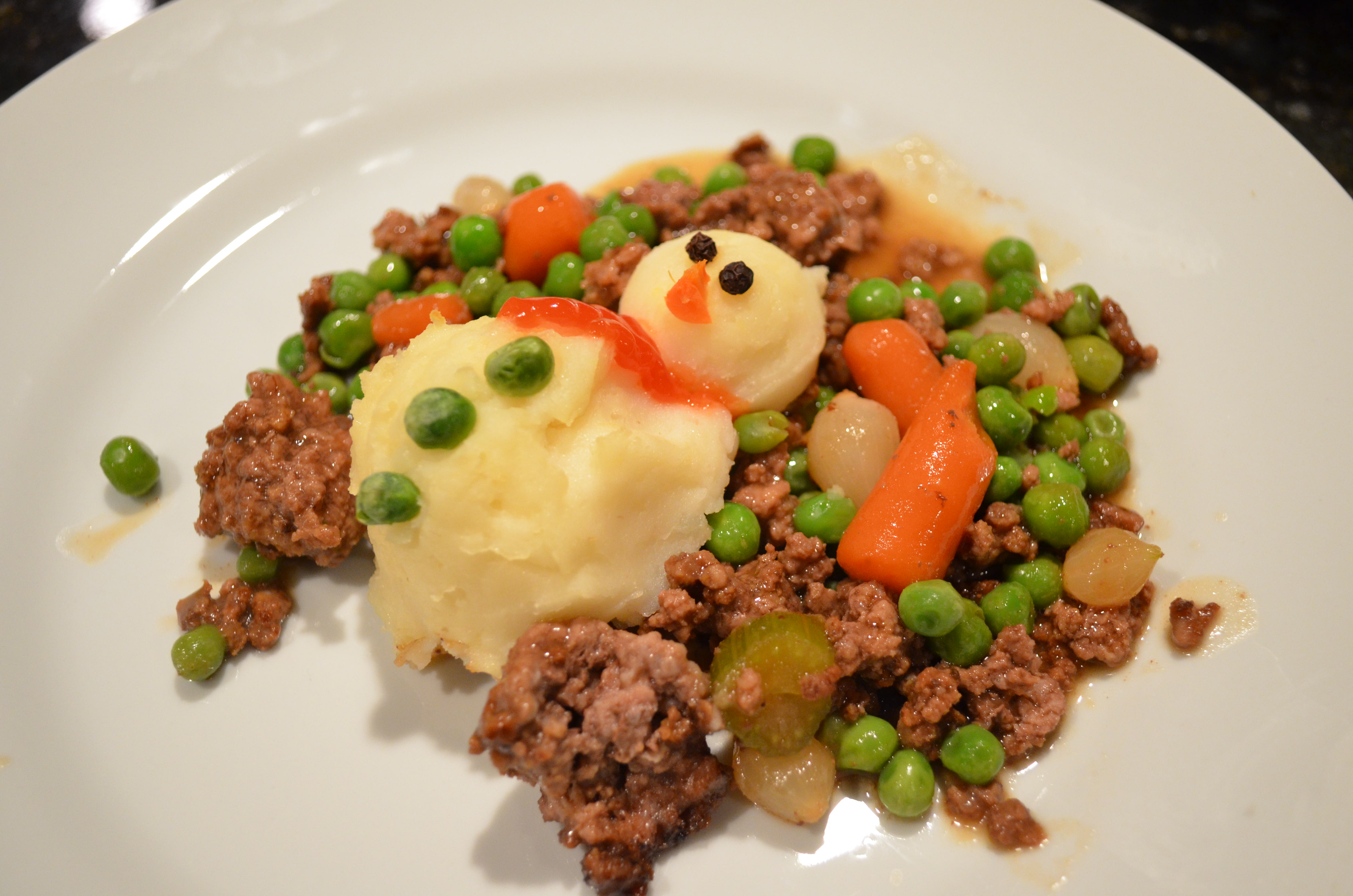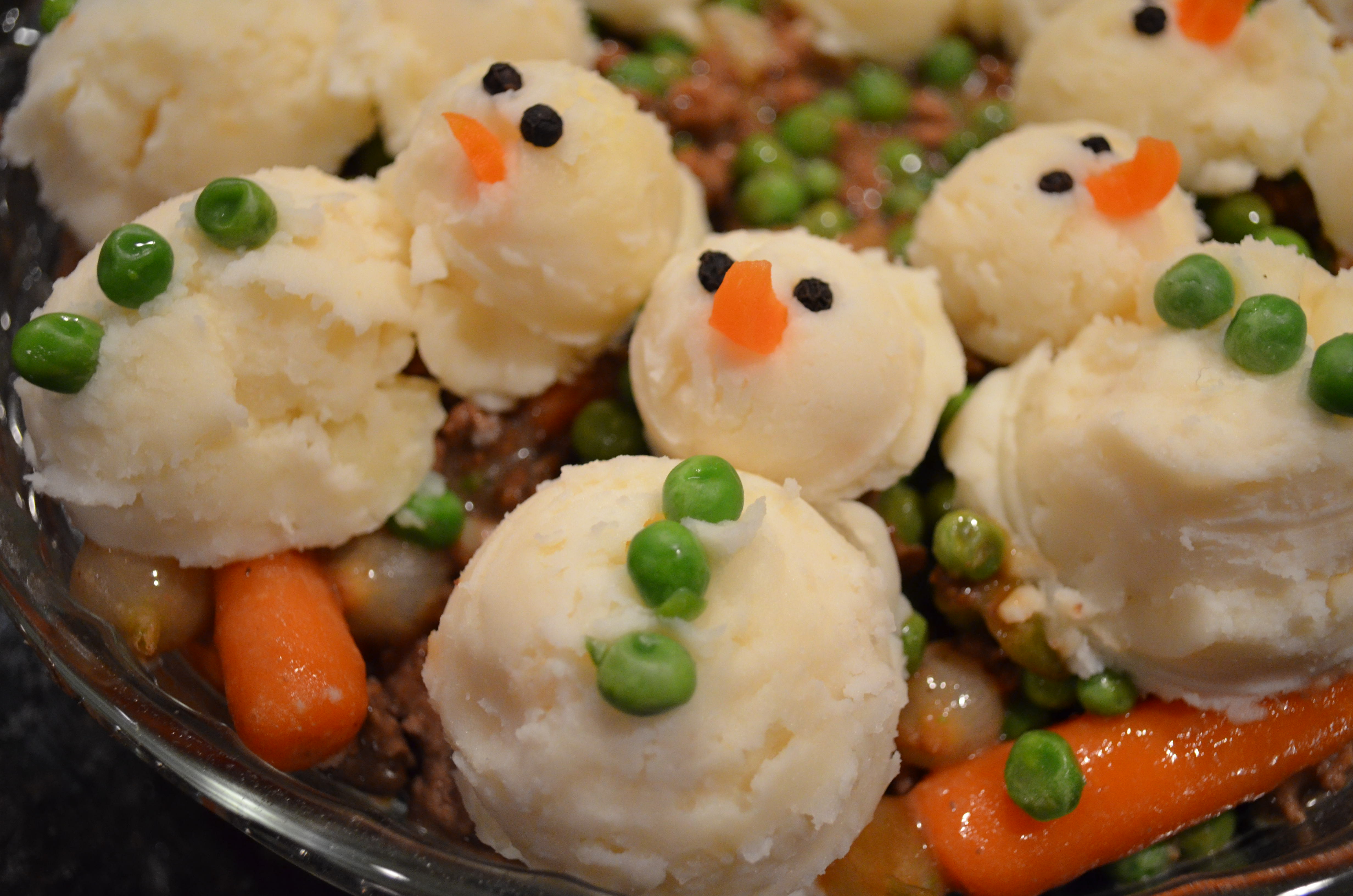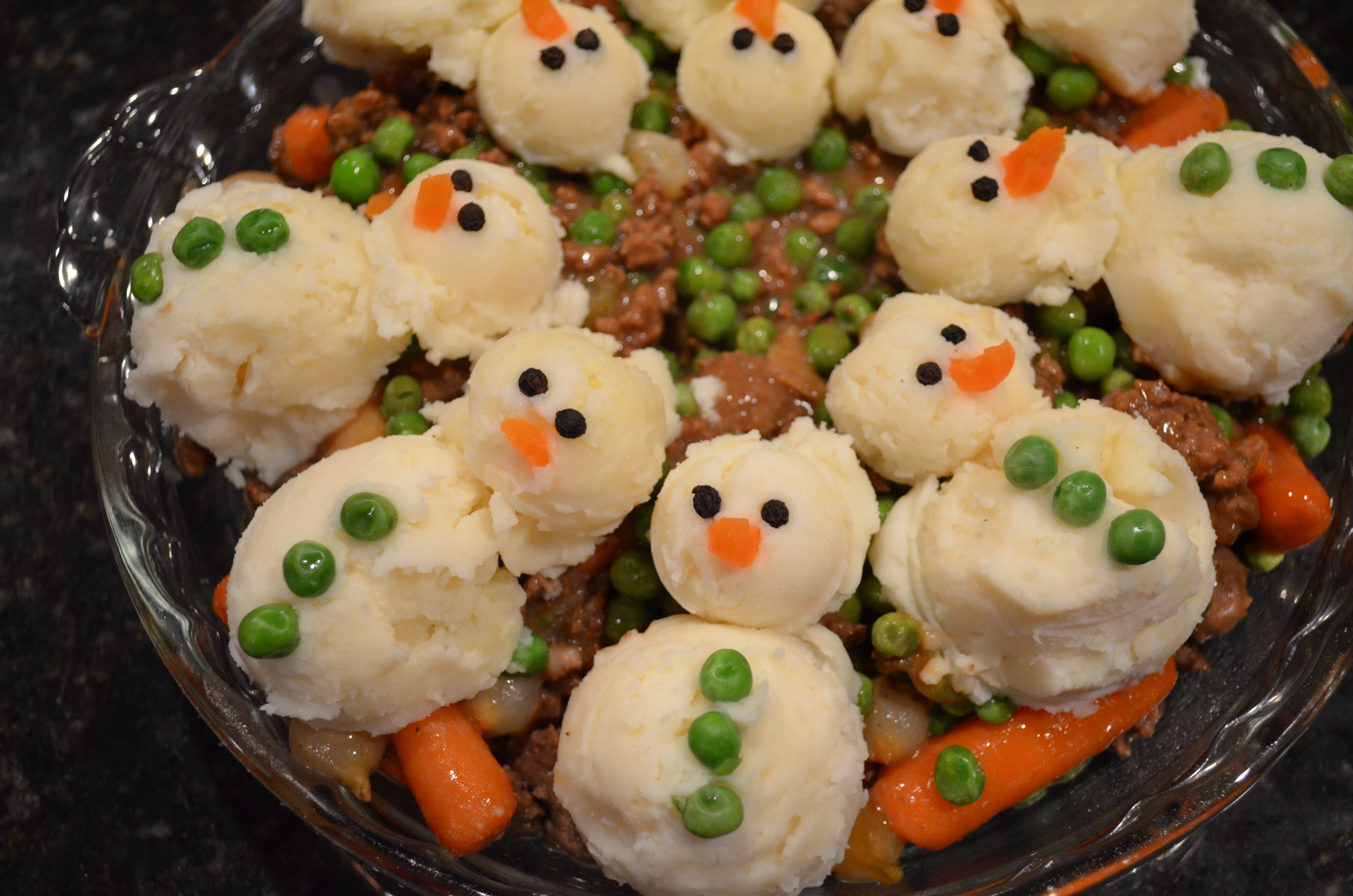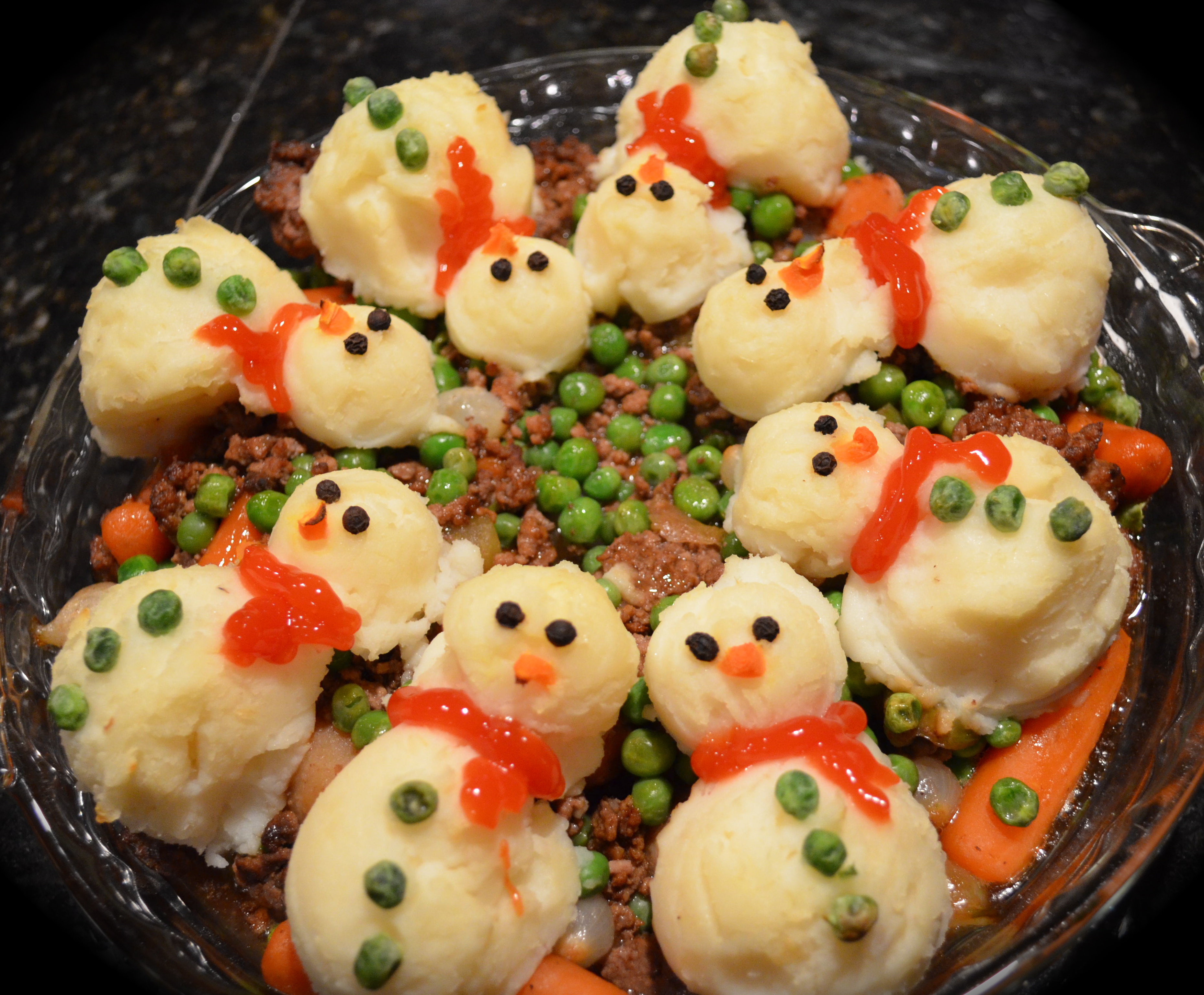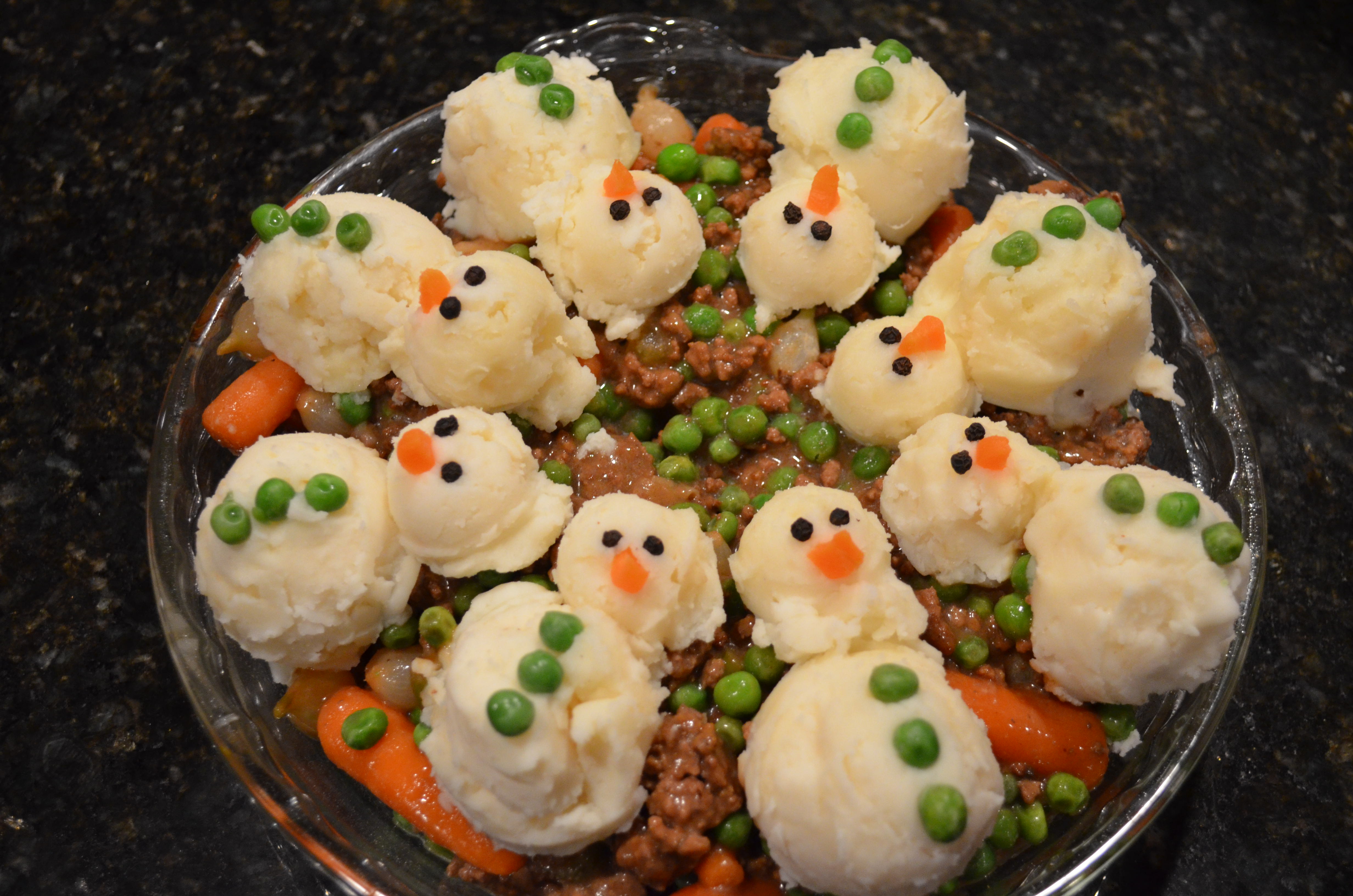 3. Pour into an ungreased 9-in. pie plate. Top with eight mashed potato snowmen, using 1 tablespoon of potatoes for each head and 3 tablespoons for each body. (I used two sizes of ice cream scoops to do this)