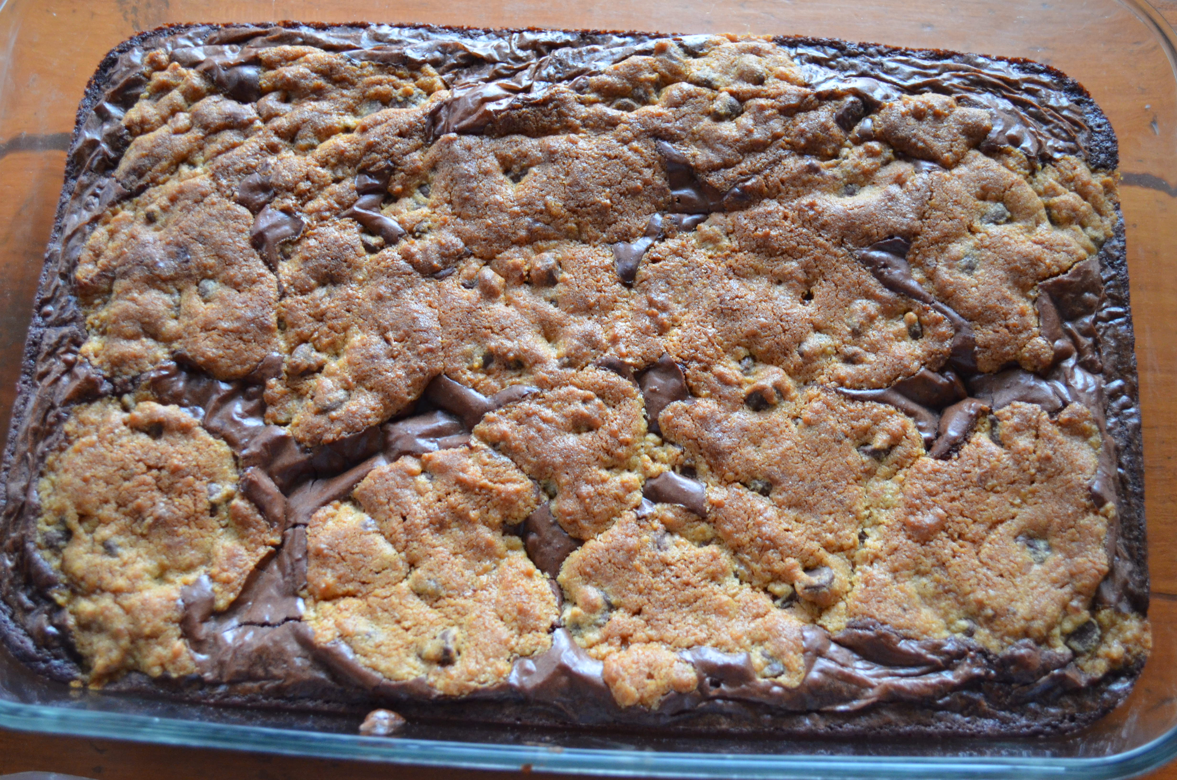 4. Drop the cookie dough by rounded tablespoons onto the brownie batter and press down slightly.